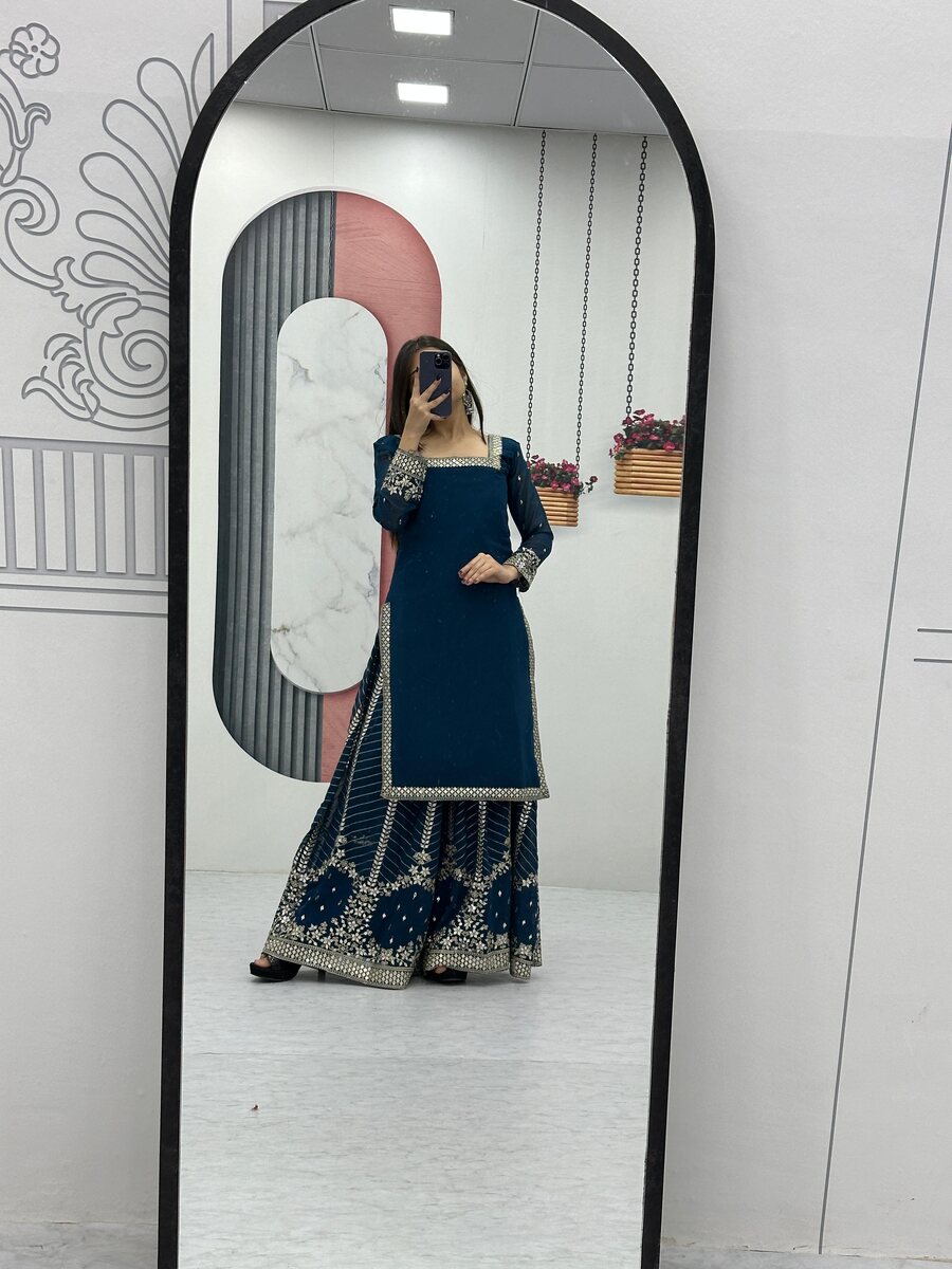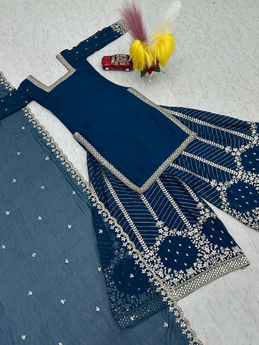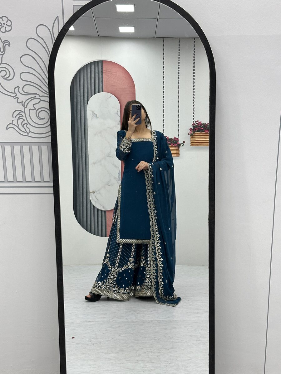 DESIGNER GEORGETTE EMBROIDERY SEQUENCE WORK TOP PALAZZO WITH DUPATTA TEAL