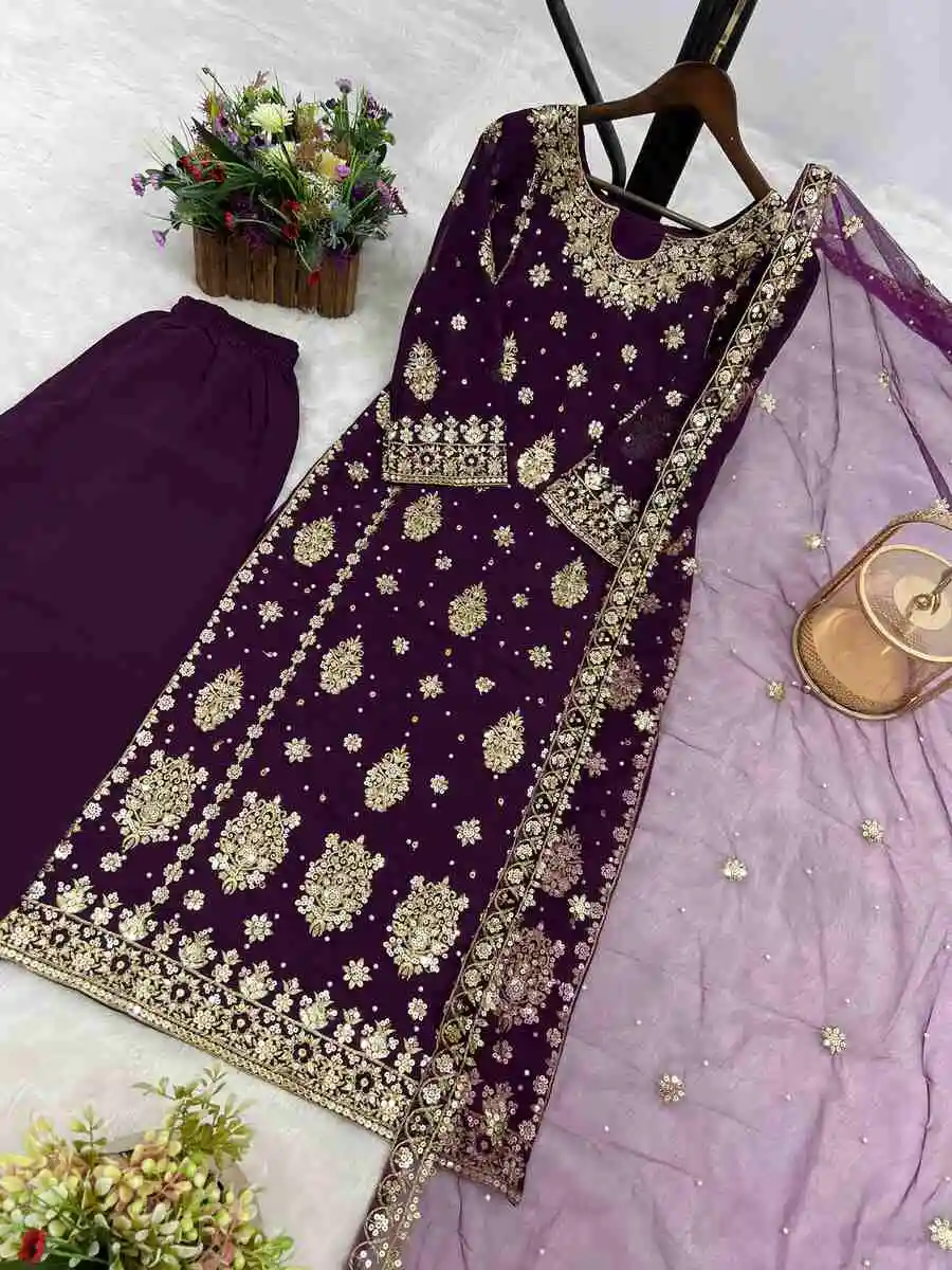 DESIGNER GEORGETTE EMBROIDERY SEQUENCE WORK TOP PALAZZO WITH DUPATTA WINE