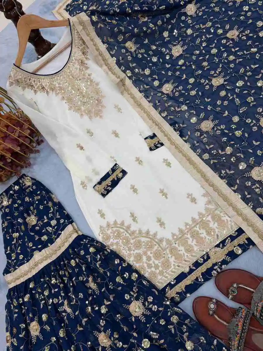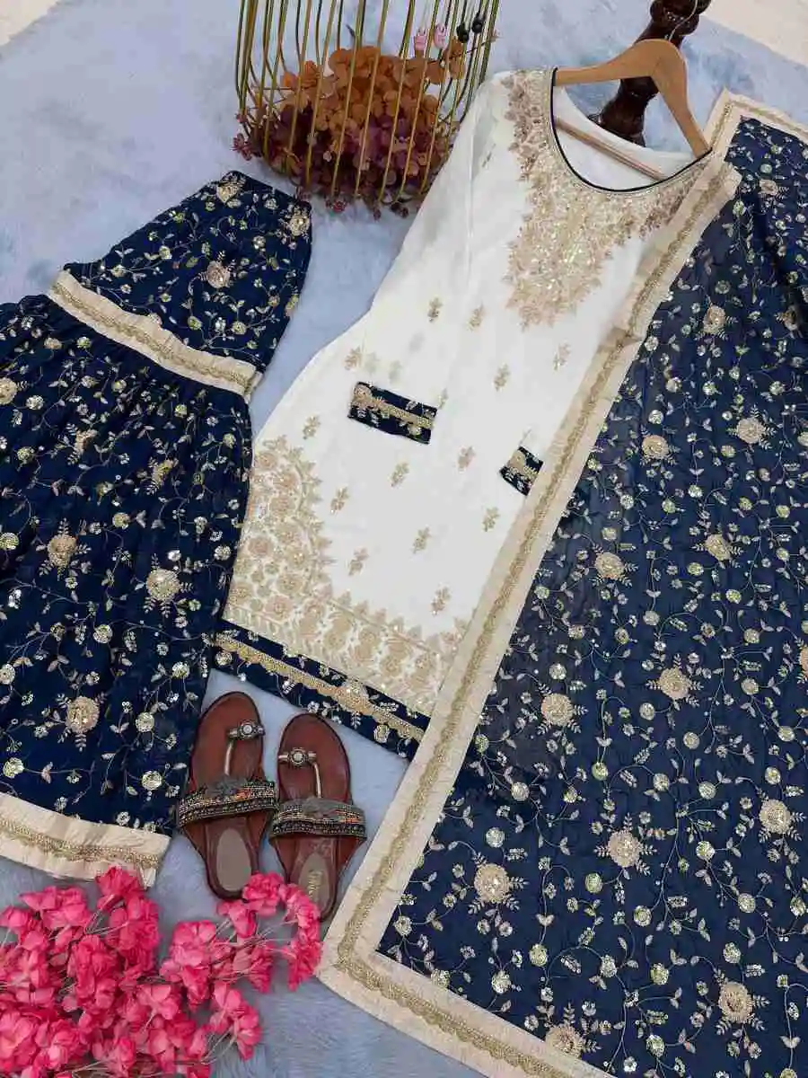 DESIGNER GEORGETTE EMBROIDERY SEQUENCE WORK TOP SHARARA WITH DUPATTA NAVY BLUE
