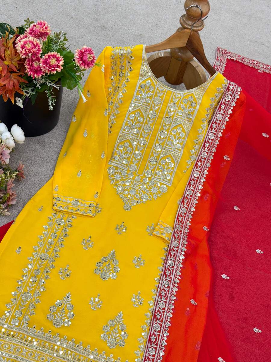 DESIGNER GEORGETTE EMBROIDERY SEQUENCE WORK TOP SHARARA WITH DUPATTA RED YELLOW