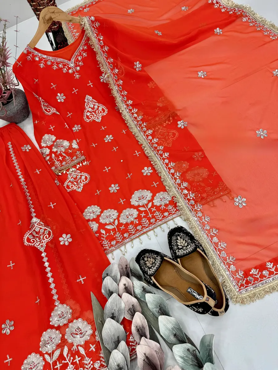 DESIGNER GEORGETTE EMBROIDERY SEQUENCE WORK WITH FANCY LACE BORDER AND PERAL MOTI HAND WORK TOP PALAZZO WITH DUPATTA ORANGE