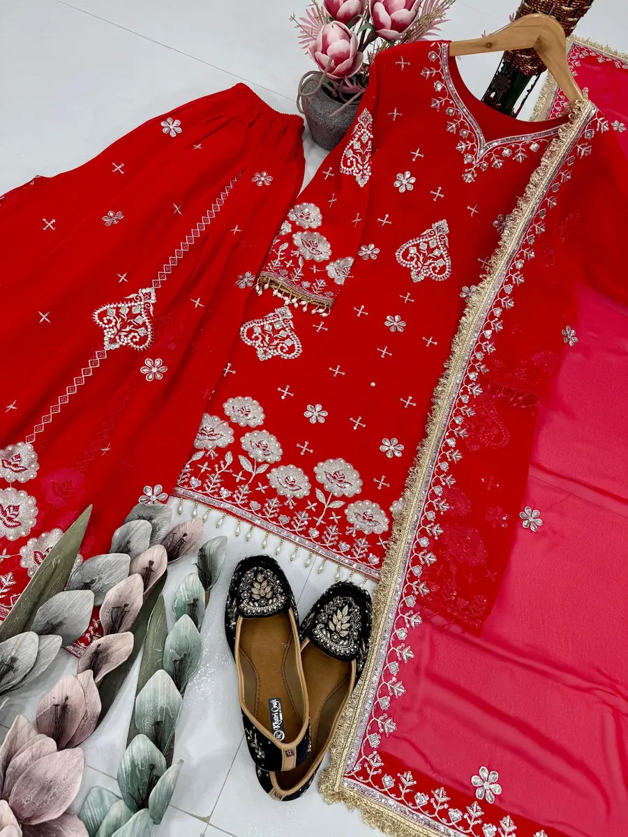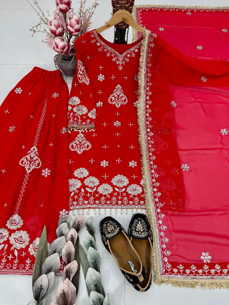 DESIGNER GEORGETTE EMBROIDERY SEQUENCE WORK WITH FANCY LACE BORDER AND PERAL MOTI HAND WORK TOP PALAZZO WITH DUPATTA RED