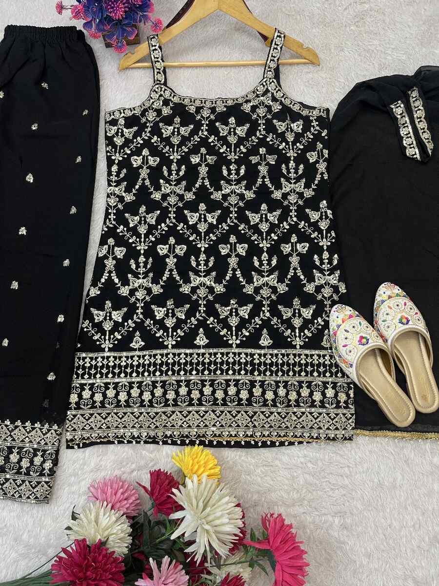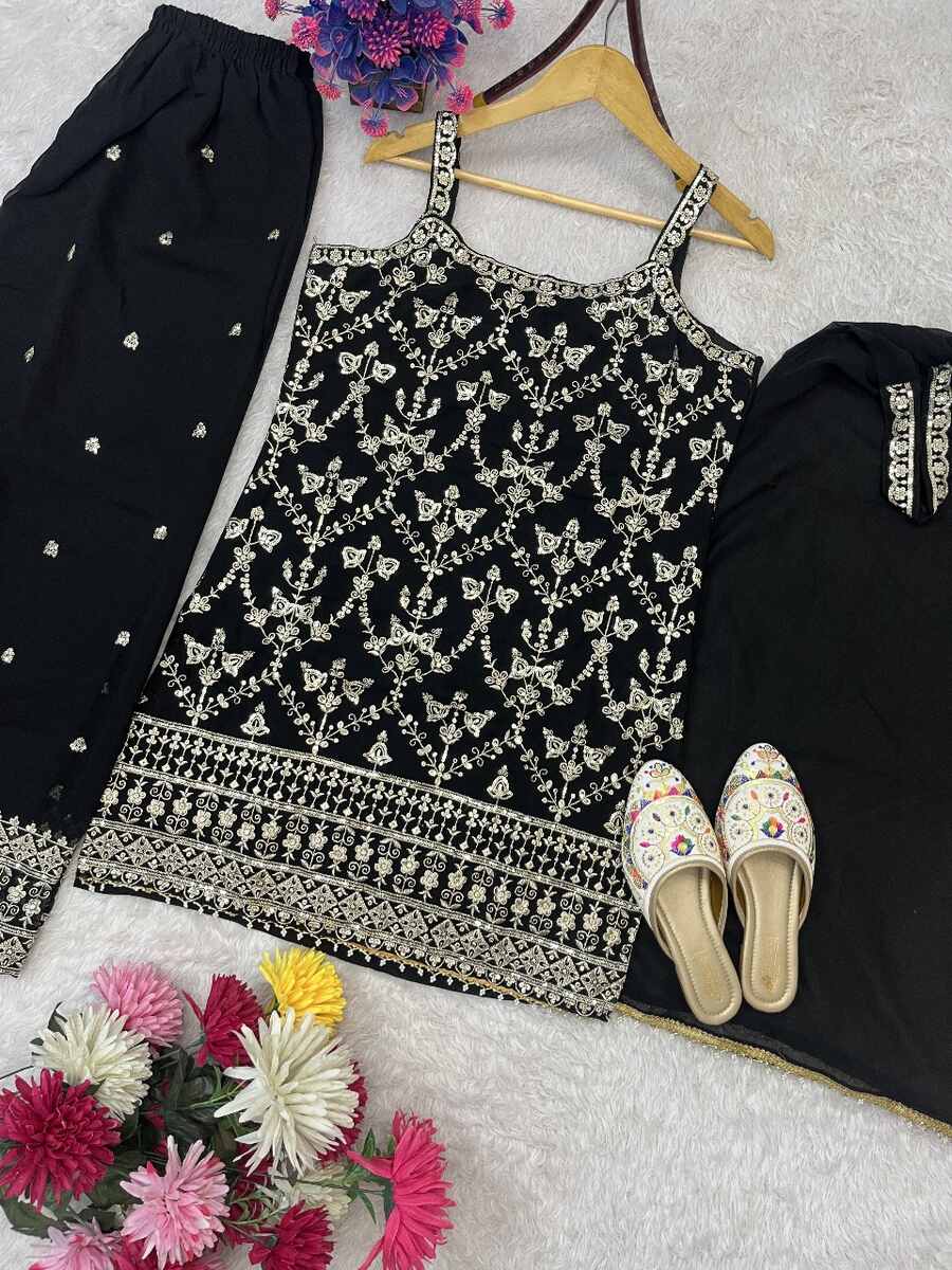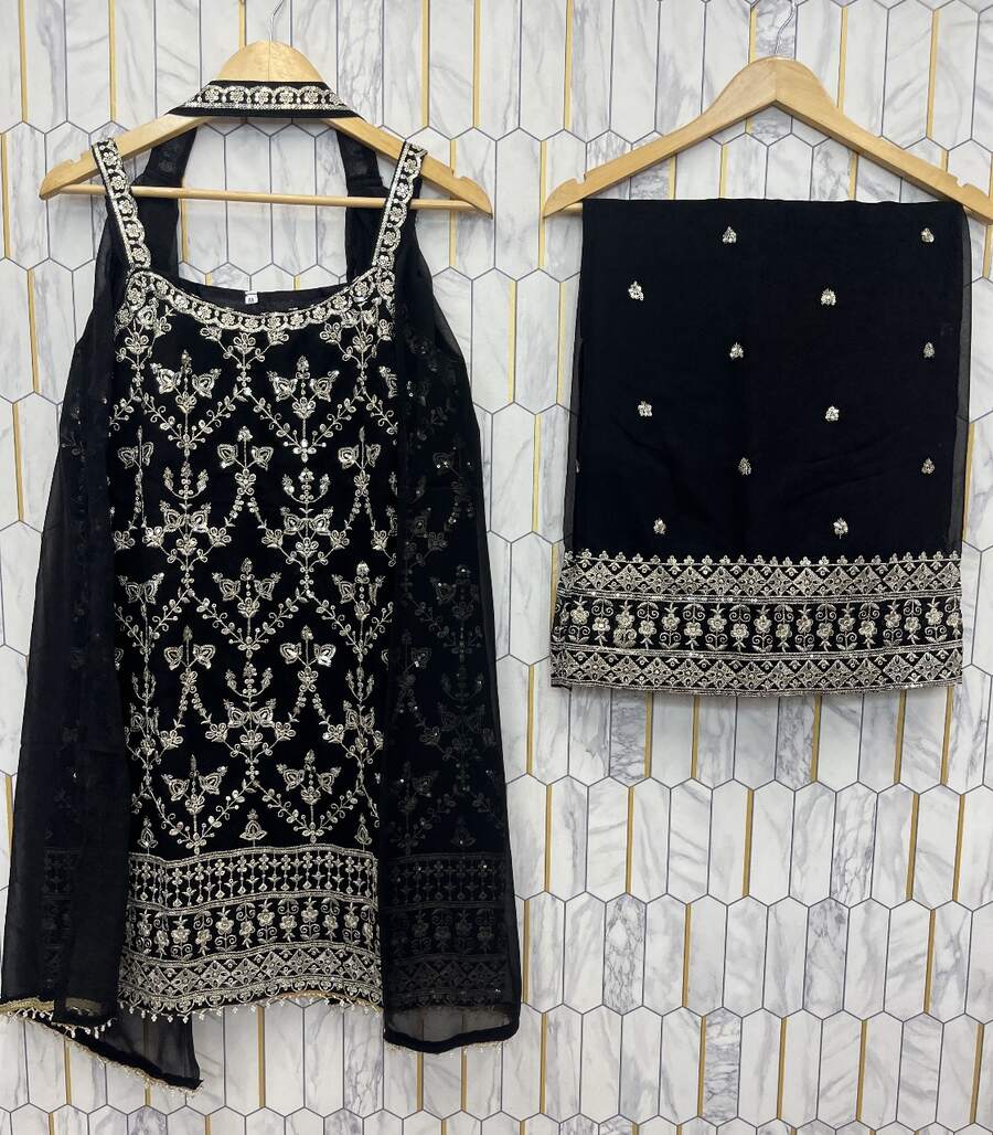 DESIGNER GEORGETTE EMBROIDERY SEQUENCE WORK WITH FANCY LATKAN WORK TOP PALAZZO WITH DUPATTA BLACK