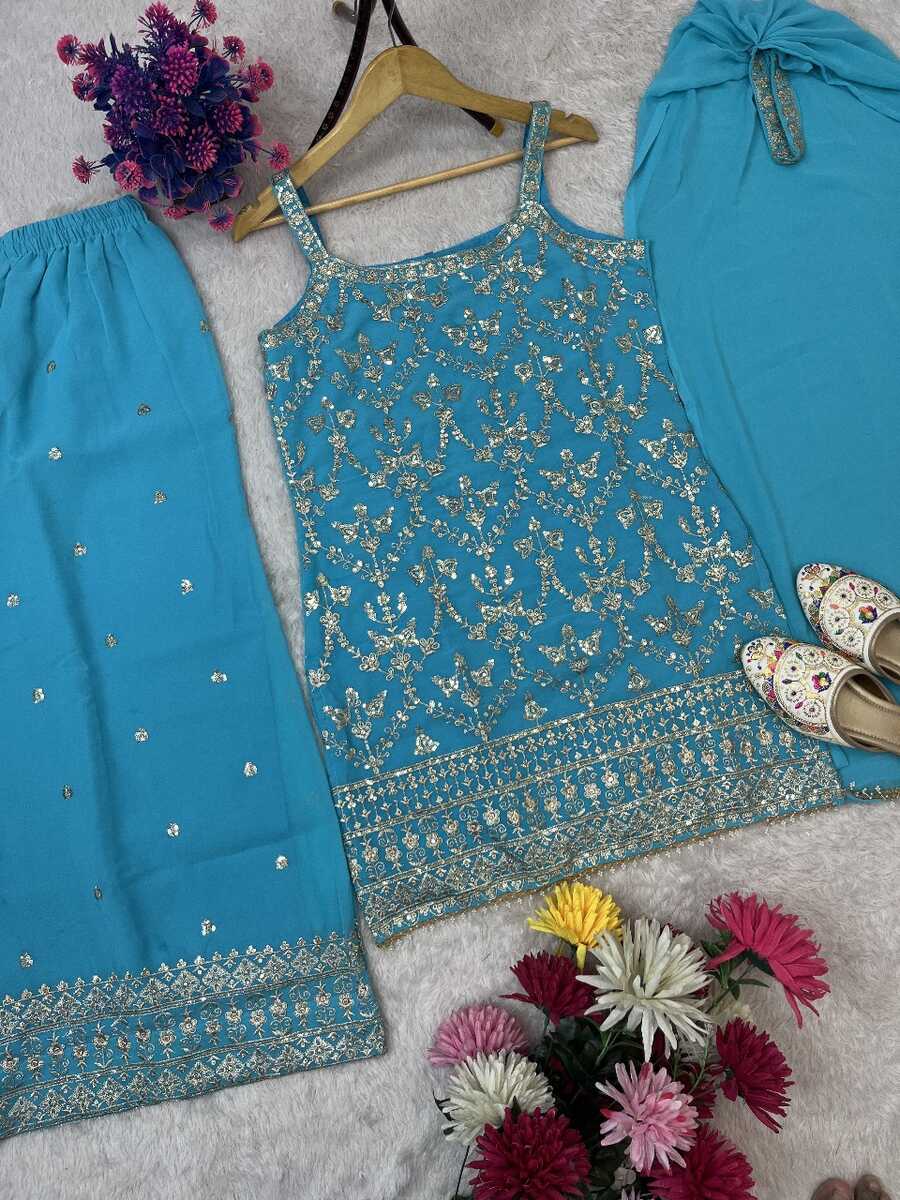 DESIGNER GEORGETTE EMBROIDERY SEQUENCE WORK WITH FANCY LATKAN WORK TOP PALAZZO WITH DUPATTA SKY