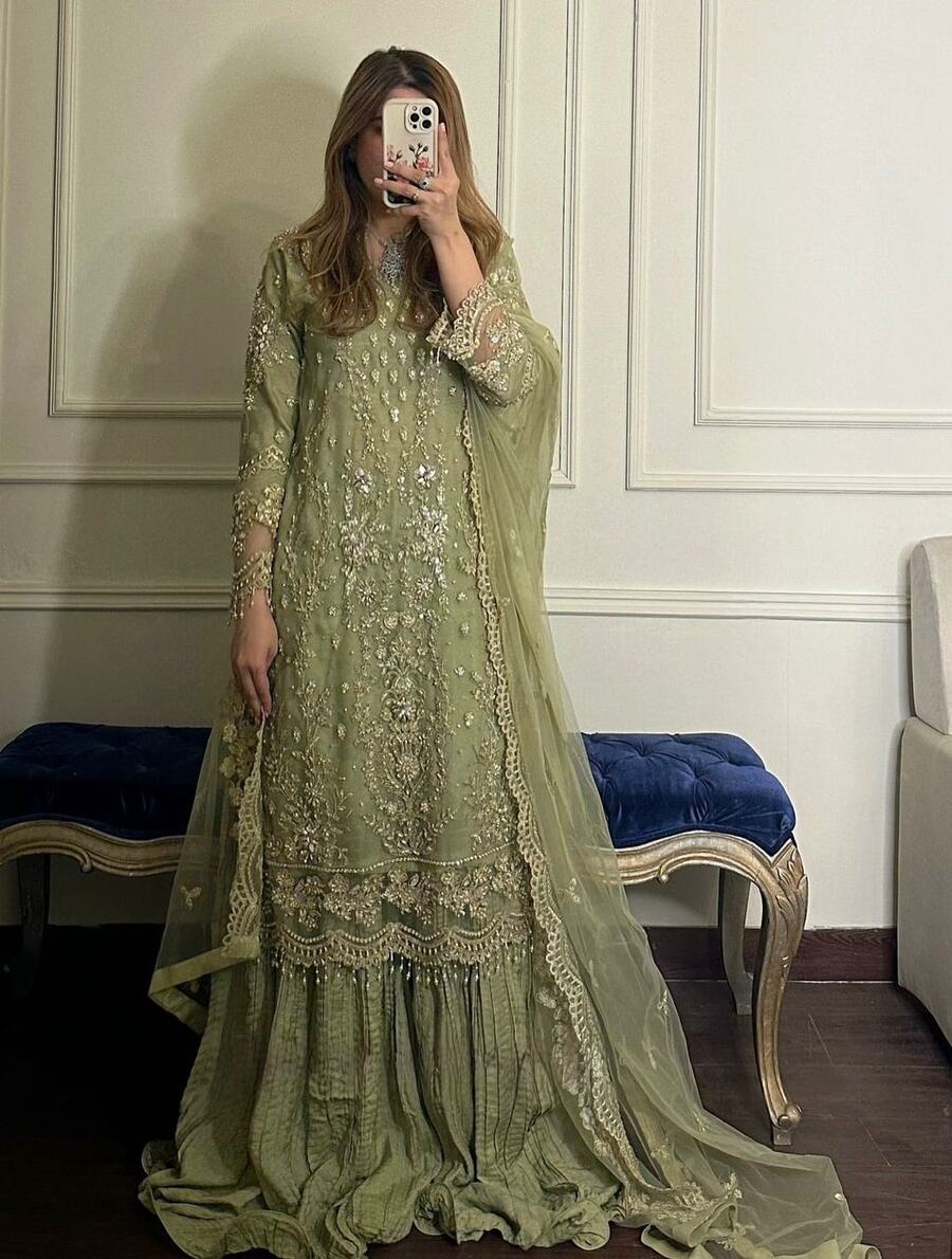 TOP FABRIC :- HEAVY FAUX GEORGETTE WITH 5 MM EMBROIDERY SEQUENCE WORK WITH FULL SLEEVE