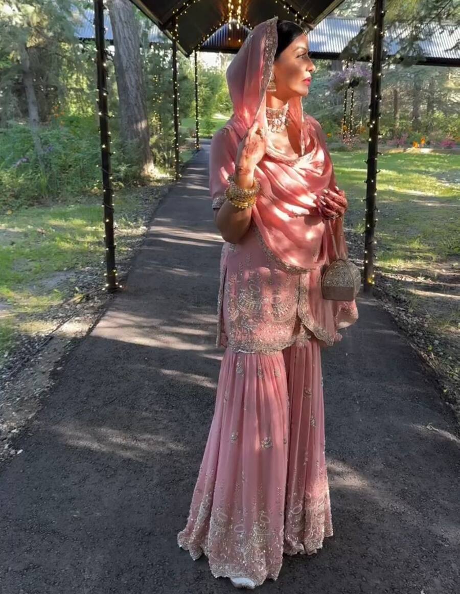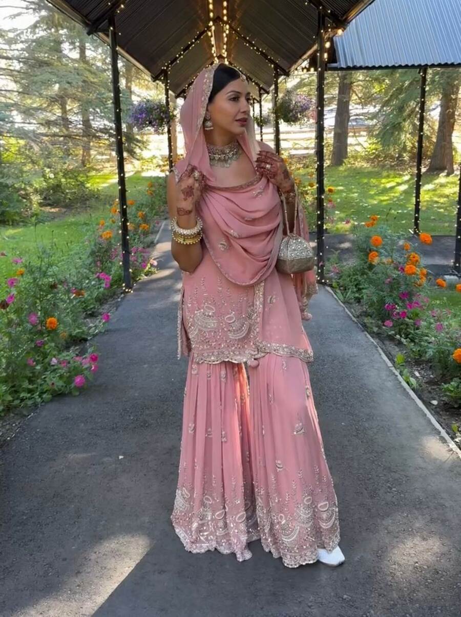 DESIGNER GEORGETTE EMBROIDERY SEQUENCE WORK WITH RIVET MOTI WORK TOP SHARARA WITH DUPATTA BABY PINK