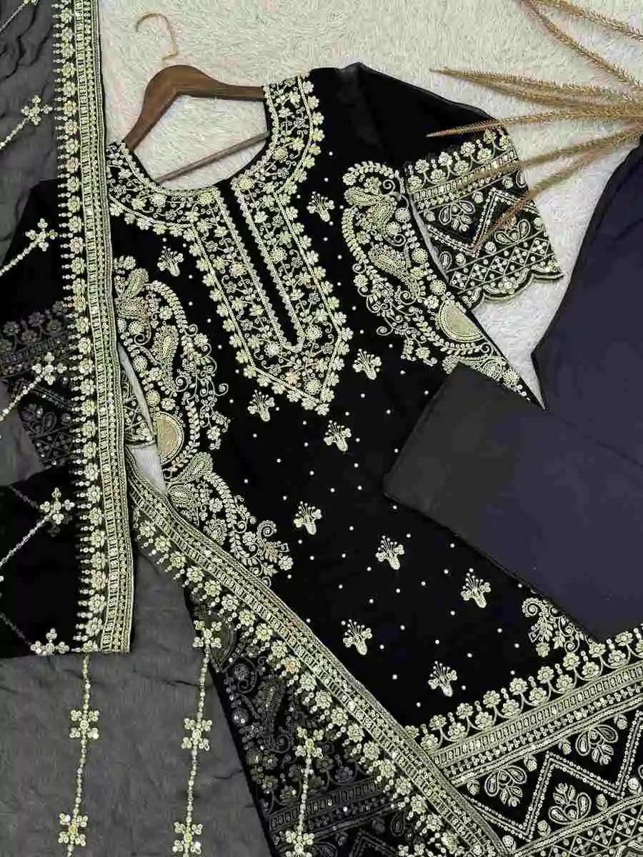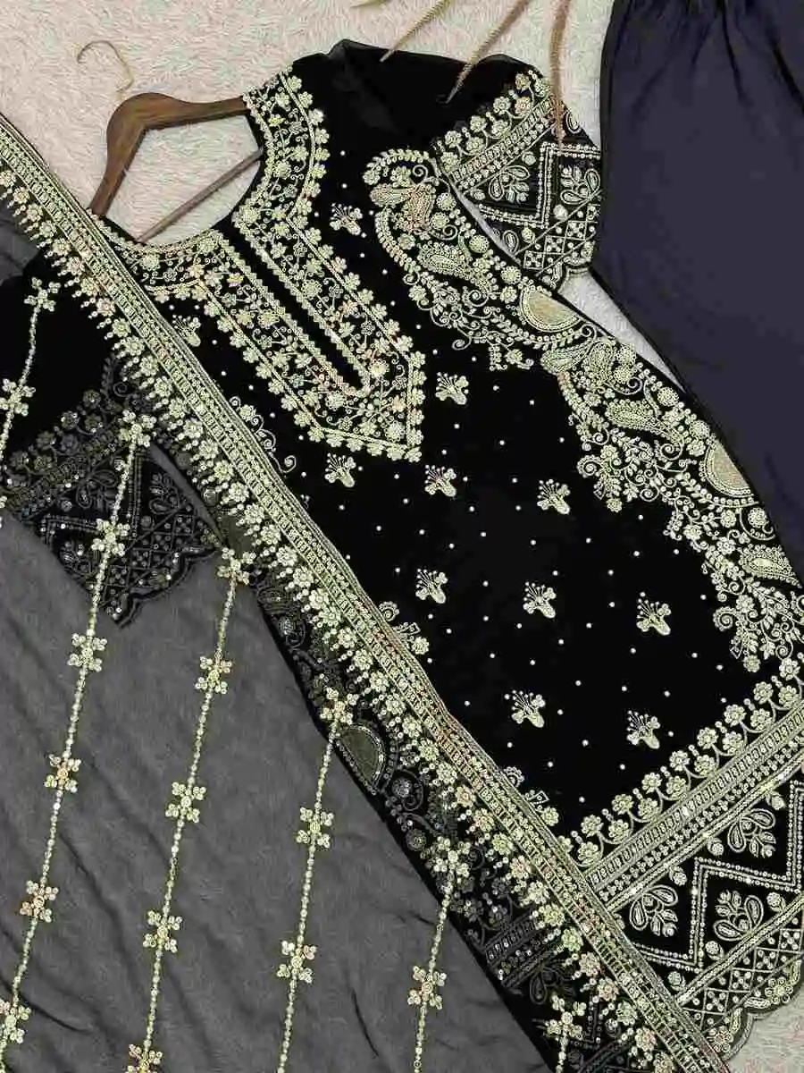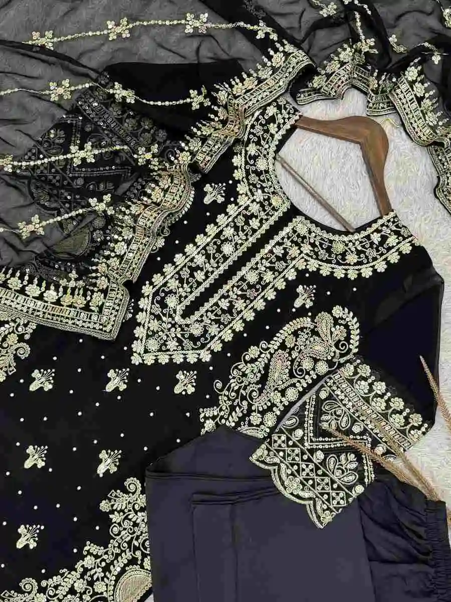 DESIGNER GEORGETTE EMBROIDERY SEQUENCE WORK WITH RIVETED MOTI WORK TOP BOTTOM WITH DUPATTA BLACK