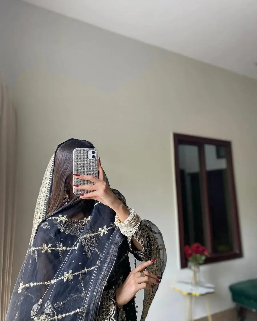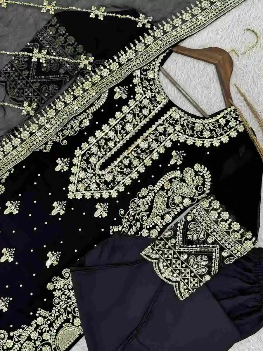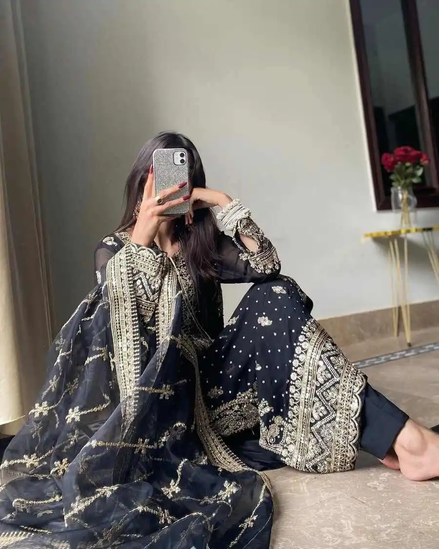 DESIGNER GEORGETTE EMBROIDERY SEQUENCE WORK WITH RIVETED MOTI WORK TOP BOTTOM WITH DUPATTA BLACK