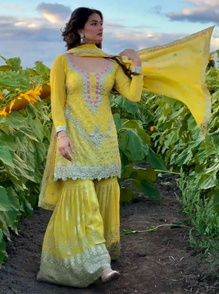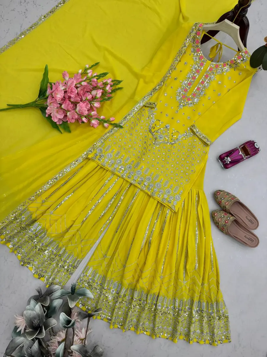 DESIGNER GEORGETTE EMBROIDERY THREAD & SEQUENCE WORK TOP PALAZZO WITH DUPATTA YELLOW