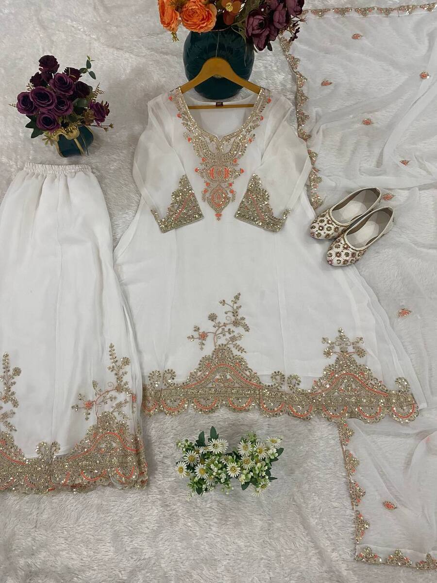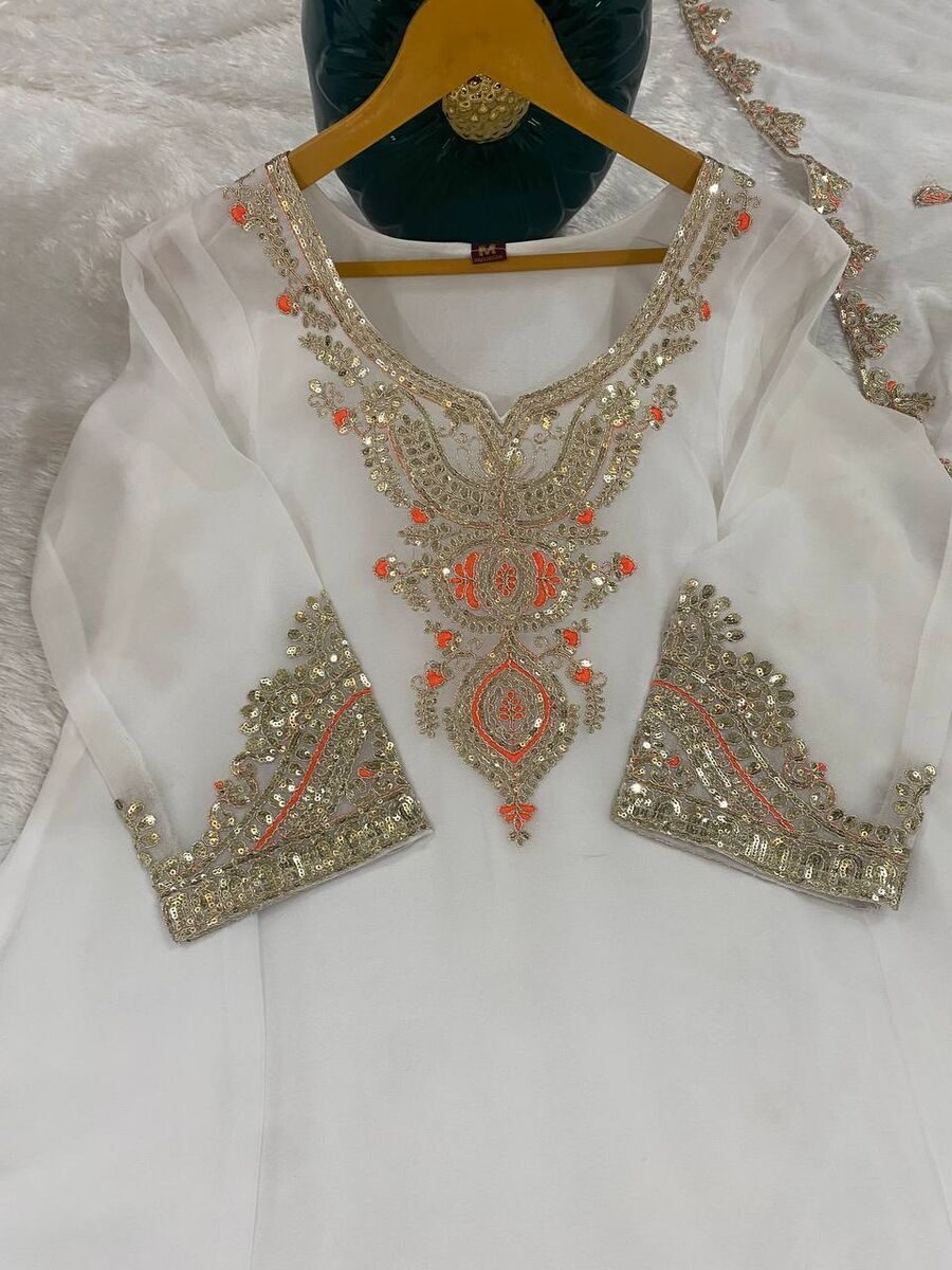 DESIGNER GEORGETTE EMBROIDERY WITH THREAD AND SEQUENCE WORK TOP PALAZZO WITH DUPATTA WHITE