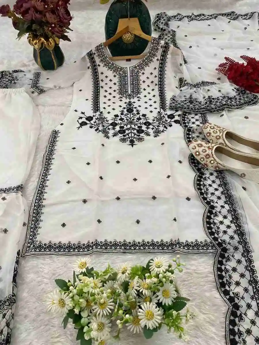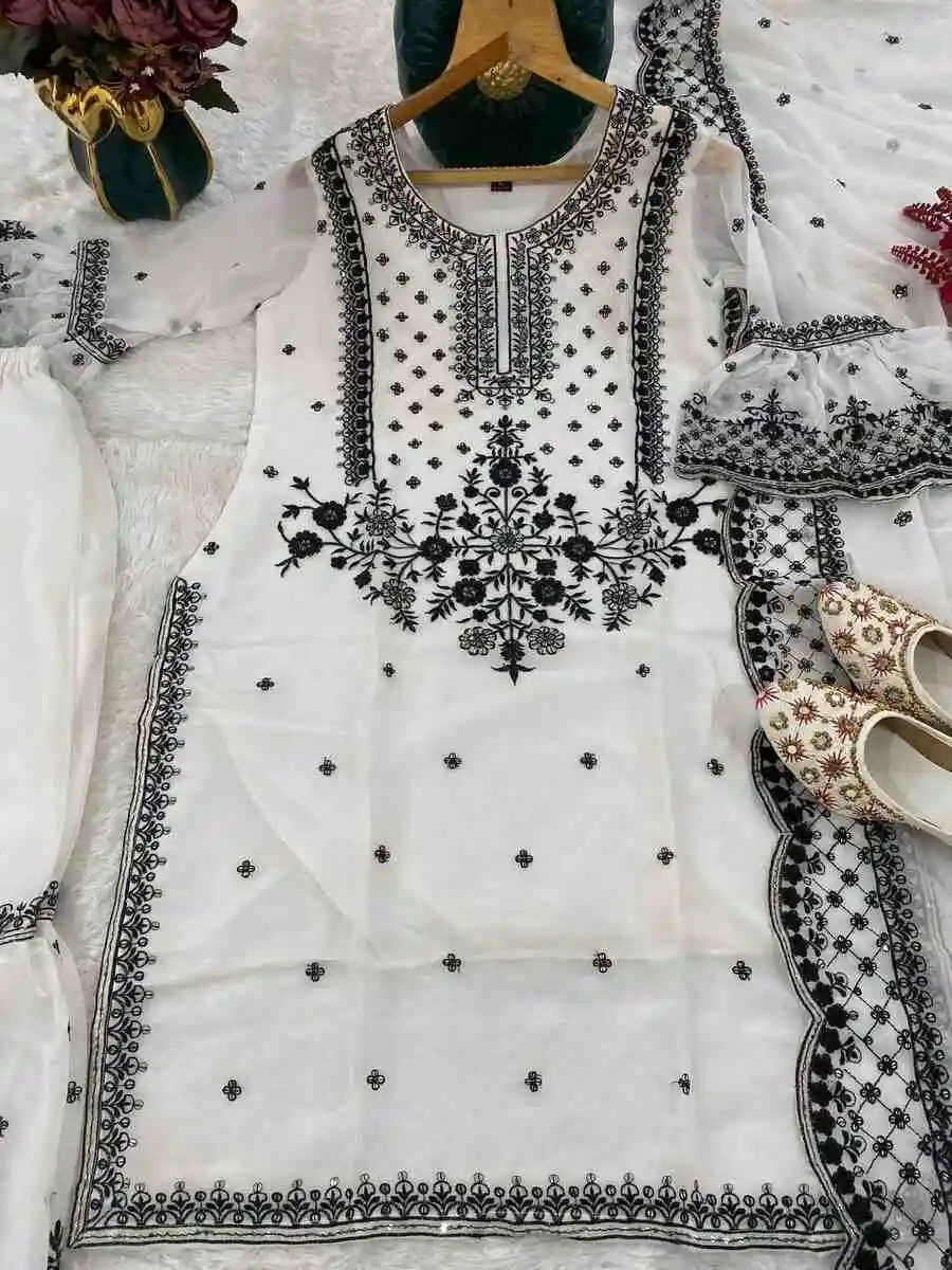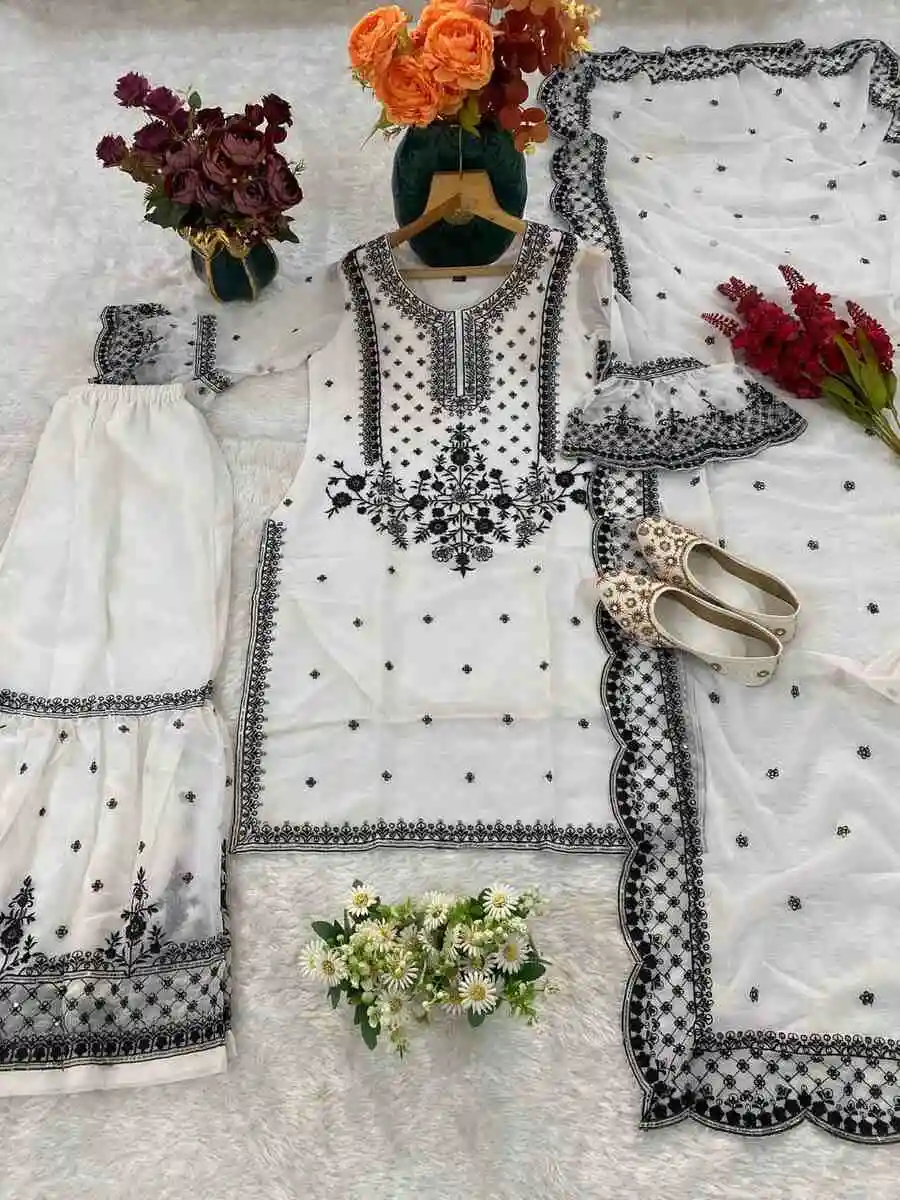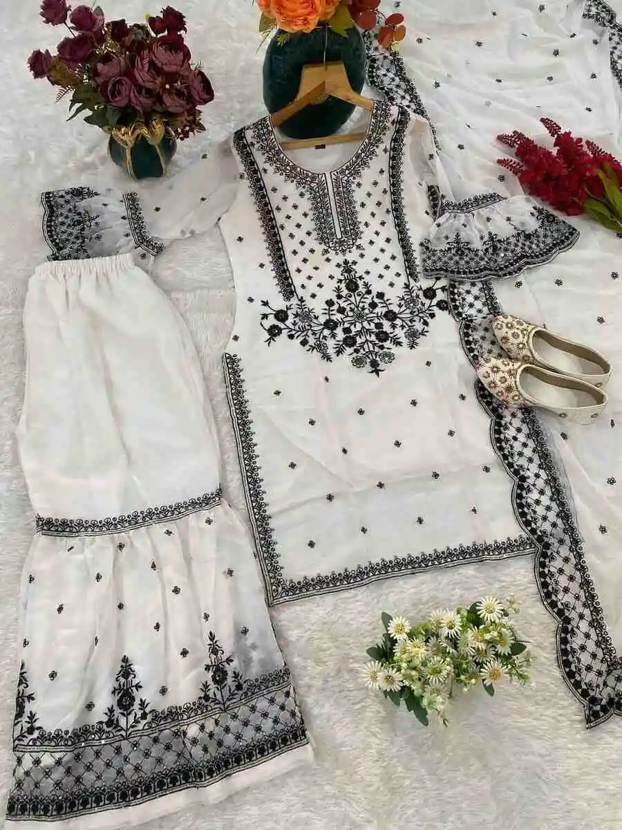 DESIGNER GEORGETTE EMBROIDERY WITH THREAD & SEQUENCE WORK TOP SHARARA WITH DUPATTA WHITE