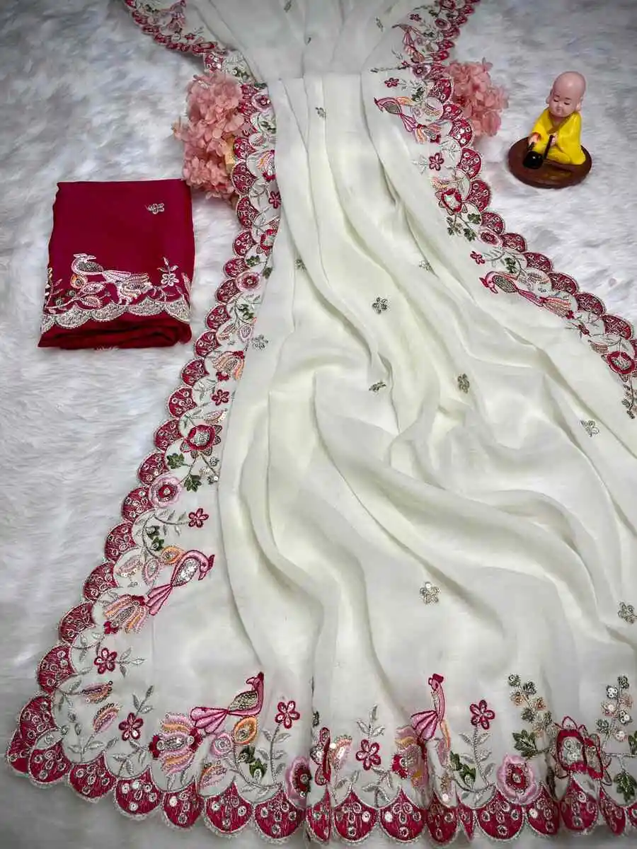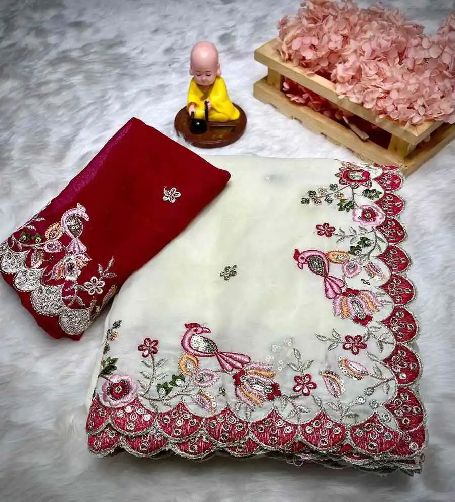 DESIGNER GEORGETTE EMBROIDERY WORK AND MULTI THREAD WITH ARCO CUT WORK BORDER WORK SAREE WITH UNSTITCHED BLOUSE OFF WHITE AND RED
