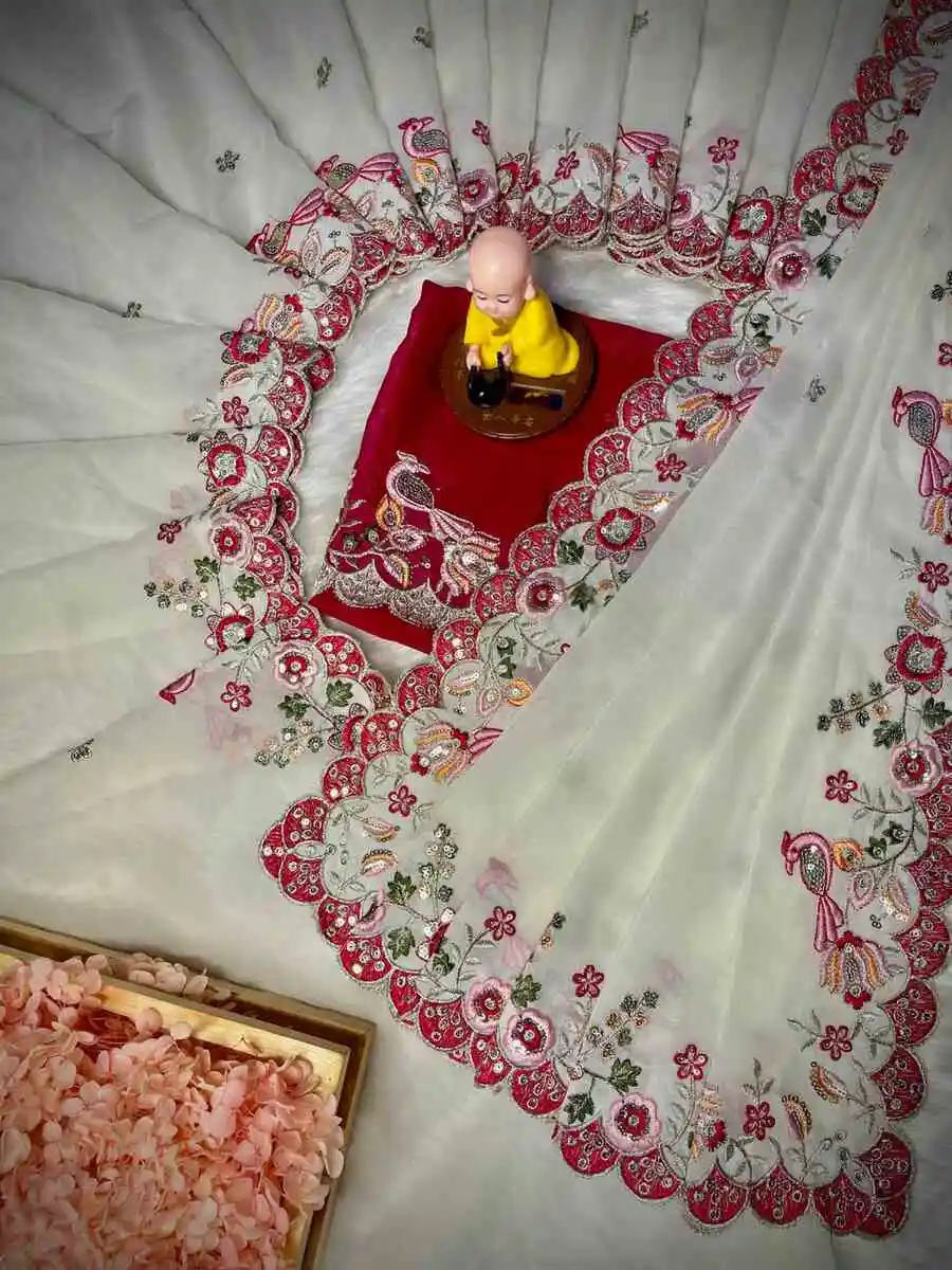 SAREE FABRIC : PREMIUM DIAMOND CHINON SILK WITH HEAVY EMBROIDERY CODING MULTI TREADS AND SEQUENCE WORK