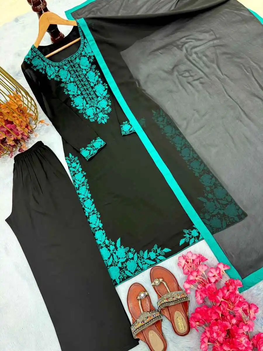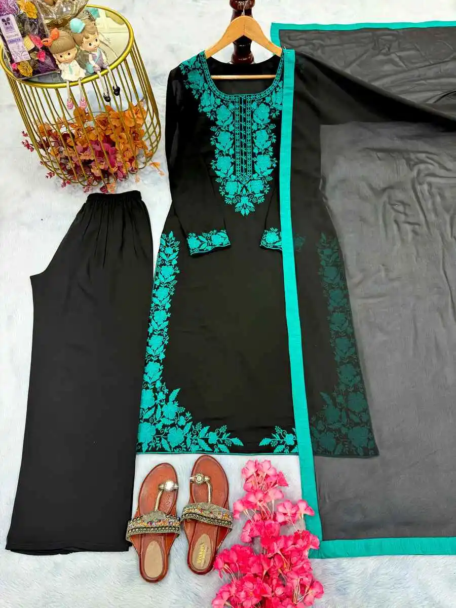 DESIGNER GEORGETTE EMBROIDERY WORK TOP PALAZZO WITH DUPATTA RAMA AND BLACK