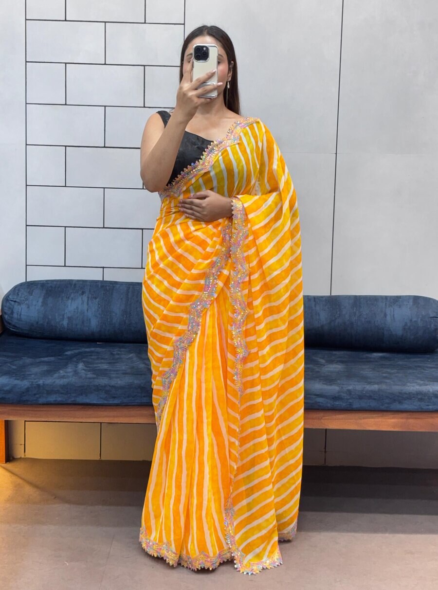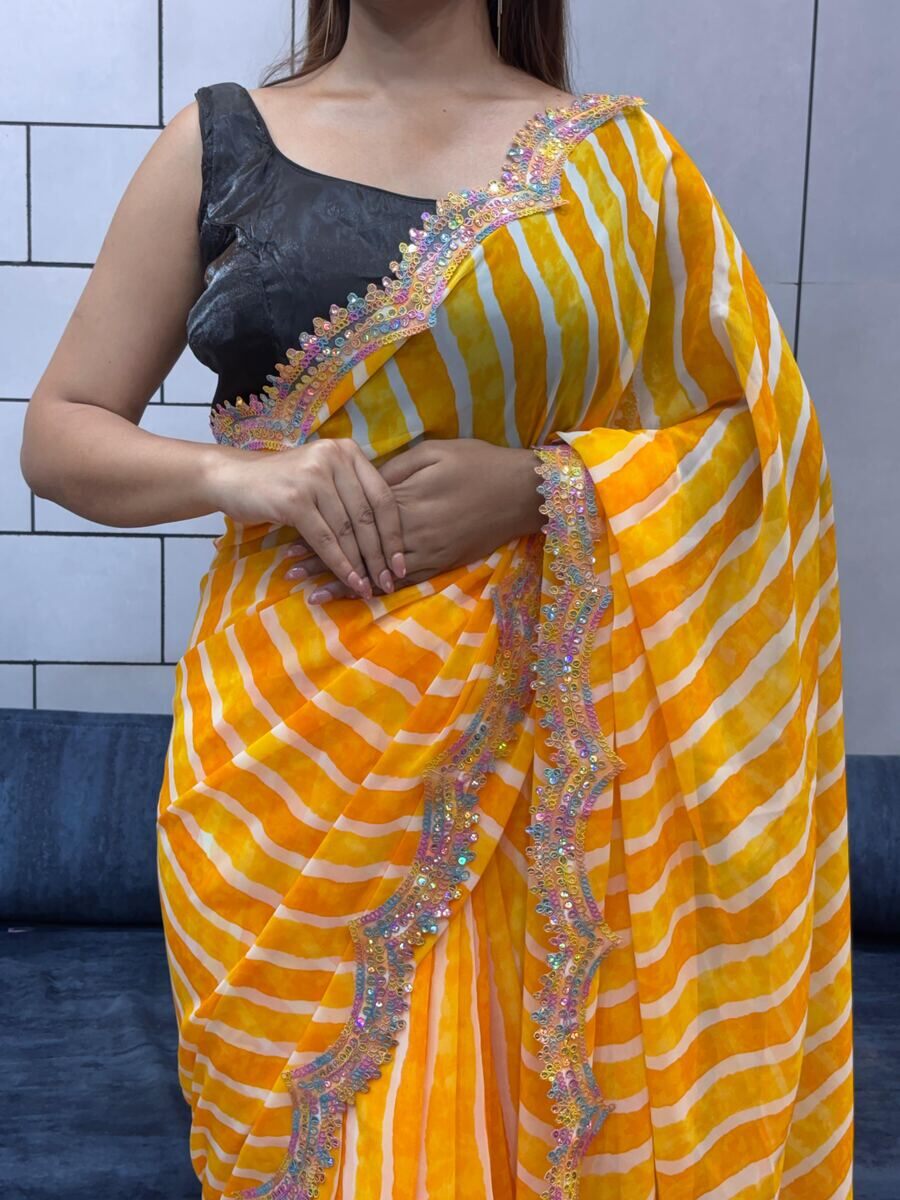 DESIGNER GEORGETTE PRINT WITH SEQUNCE EMBROIDERY WORK CUT WORK LACE BORDER WORK SAREE WITH UNSTITCHED BLOUSE YELLOW
