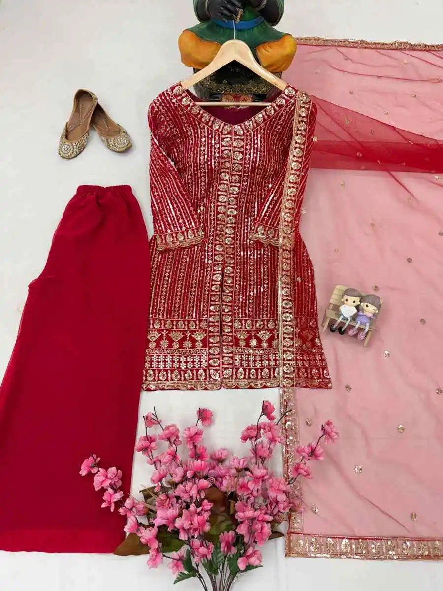 DESIGNER GEORGETTE SEQUENCE & ZARI EMBROIDERY WORK TOP PALAZZO WITH DUPATTA RED