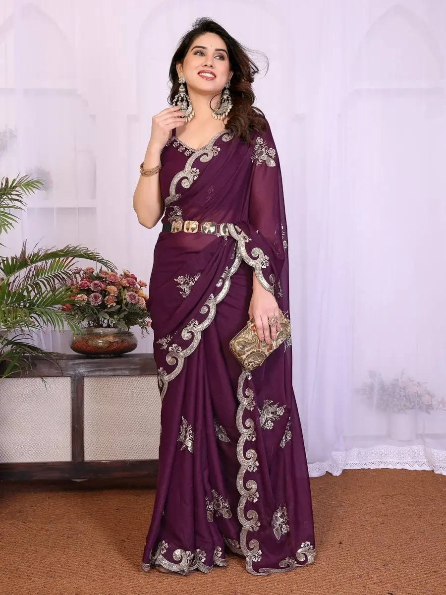 DESIGNER GEORGETTE SILK SEQUENCE EMBROIDERY WORK SAREE WITH UNSTITCHED BLOUSE PURPLE
