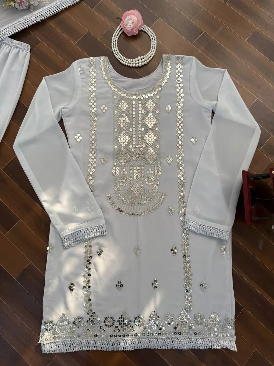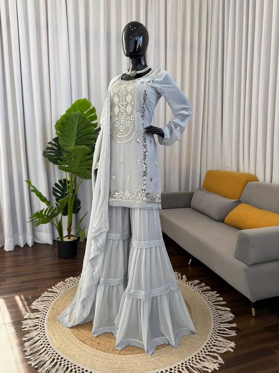 DESIGNER GEORGETTE THREAD & 9 MM SEQUENCE WORK TOP SHARARA WITH DUPATTA GREY