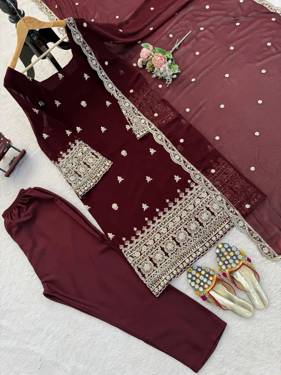 DESIGNER GEORGETTE THREAD & SEQUENCE WORK TOP BOTTOM WITH DUPATTA BROWN