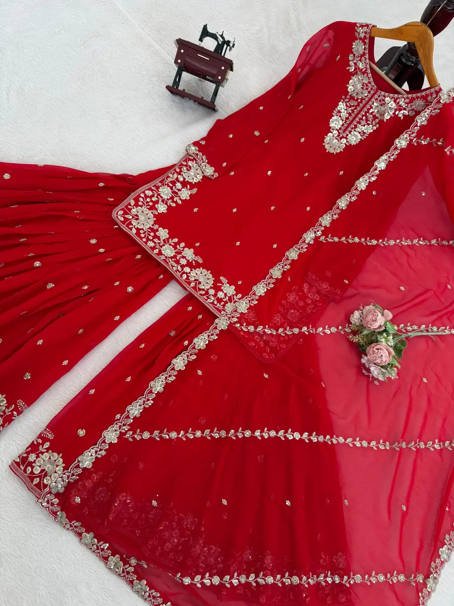 DESIGNER GEORGETTE THREAD & SEQUENCE WORK TOP SHARARA WITH DUPATTA RED