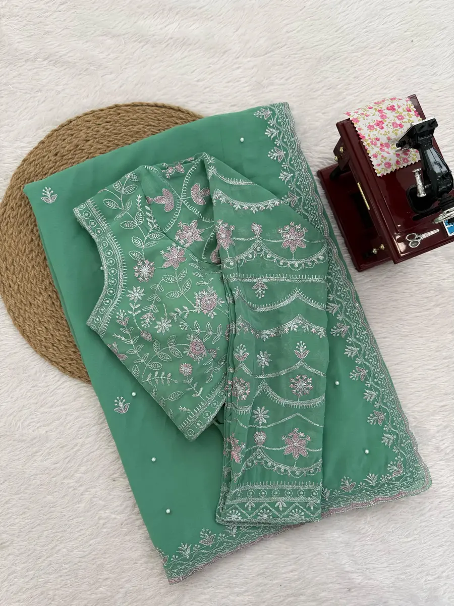 DESIGNER GEORGETTE THREAD & SEQUNCE WORK WITH PEARL WORK SAREE WITH UNSTITCHED BLOUSE SEA GREEN
