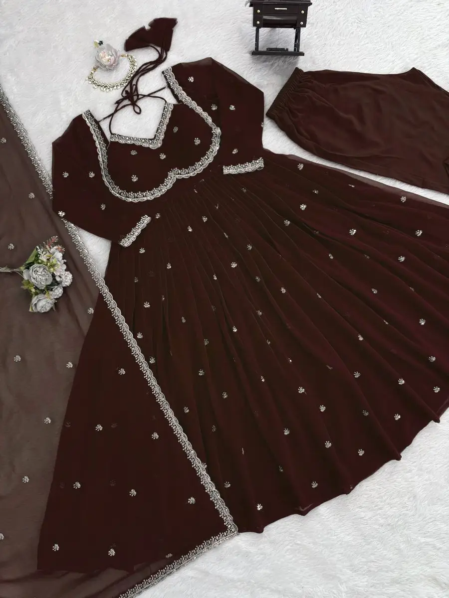 DESIGNER GEORGETTE THREAD WITH SEQUENCE WORK GOWN BOTTOM WITH DUPATTA BROWN