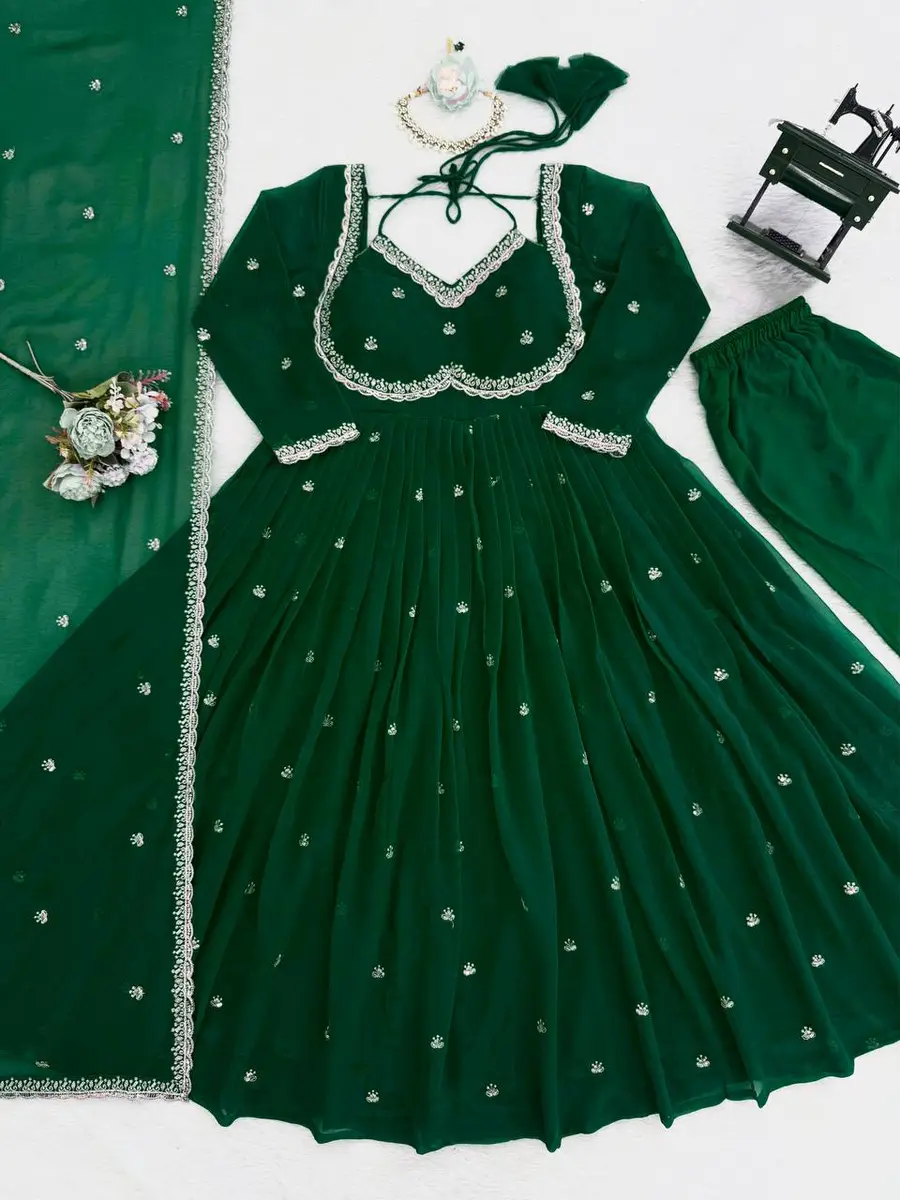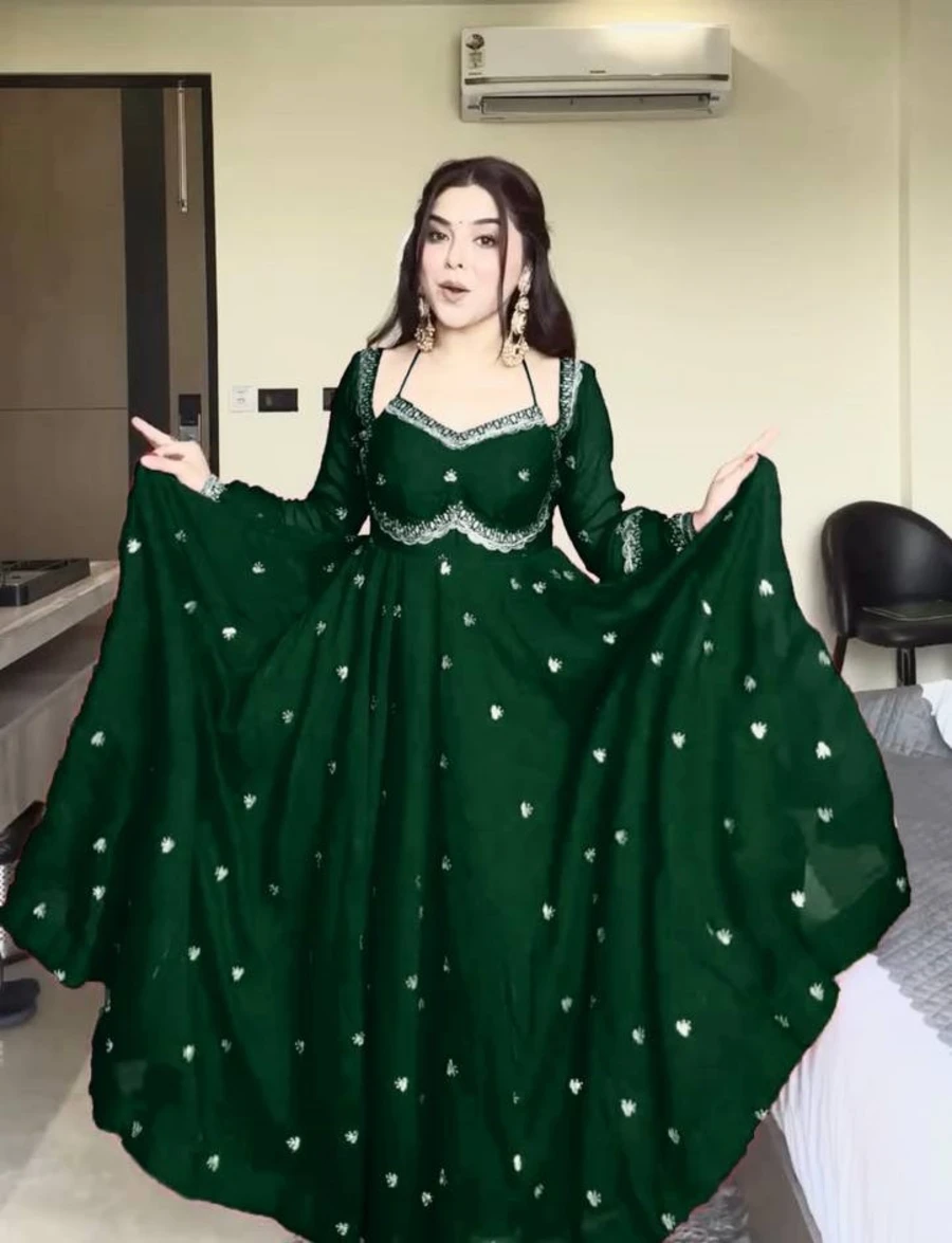 DESIGNER GEORGETTE THREAD WITH SEQUENCE WORK GOWN BOTTOM WITH DUPATTA GREEN