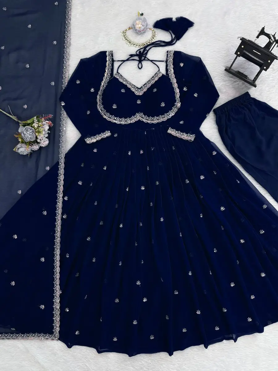 DESIGNER GEORGETTE THREAD WITH SEQUENCE WORK GOWN BOTTOM WITH DUPATTA NAVY BLUE