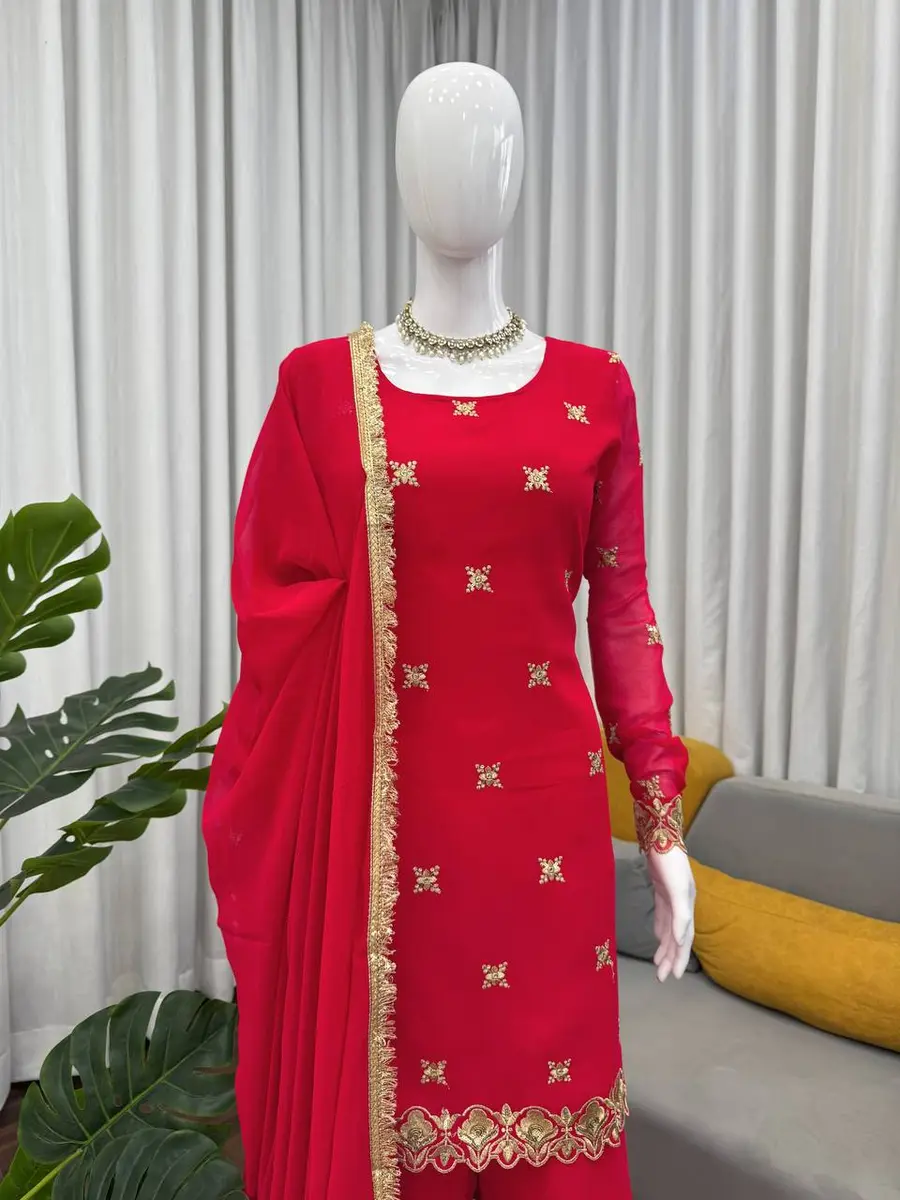 DESIGNER GEORGETTE THREAD WITH SEQUENCE WORK TOP SHARARA WITH DUPATTA RED