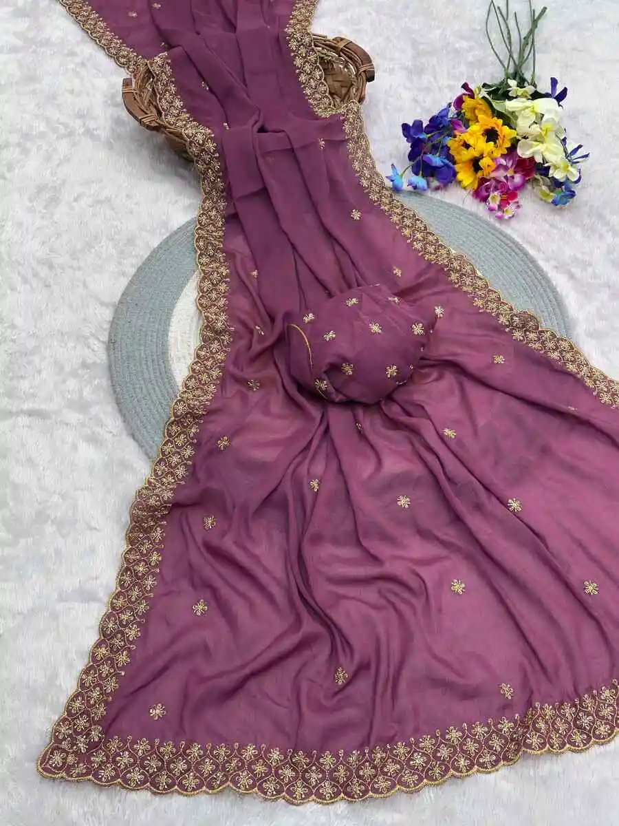SAREE FABRIC : PREMIUM DIAMOND CHINON SILK WITH HEAVY EMBROIDERY CODING MULTI TREADS AND SEQUENCE WORK