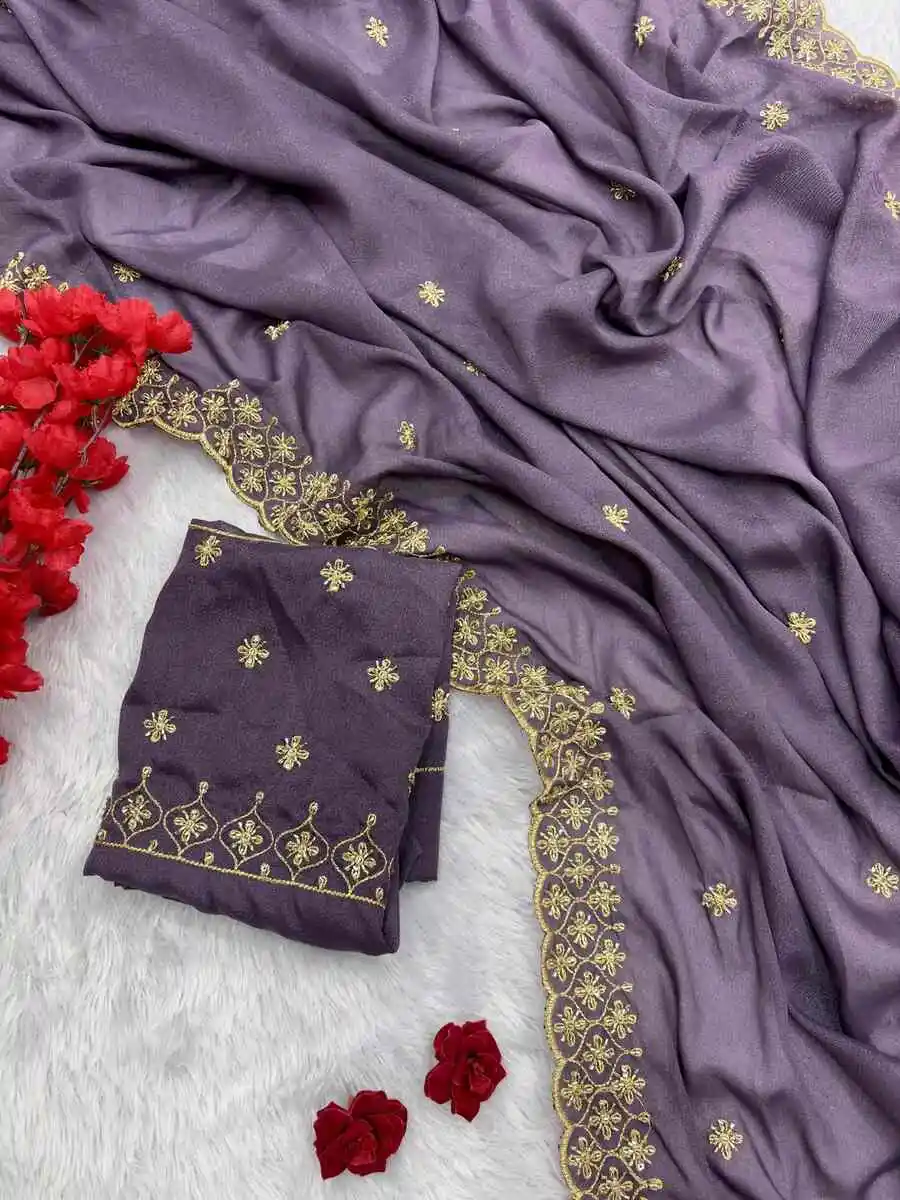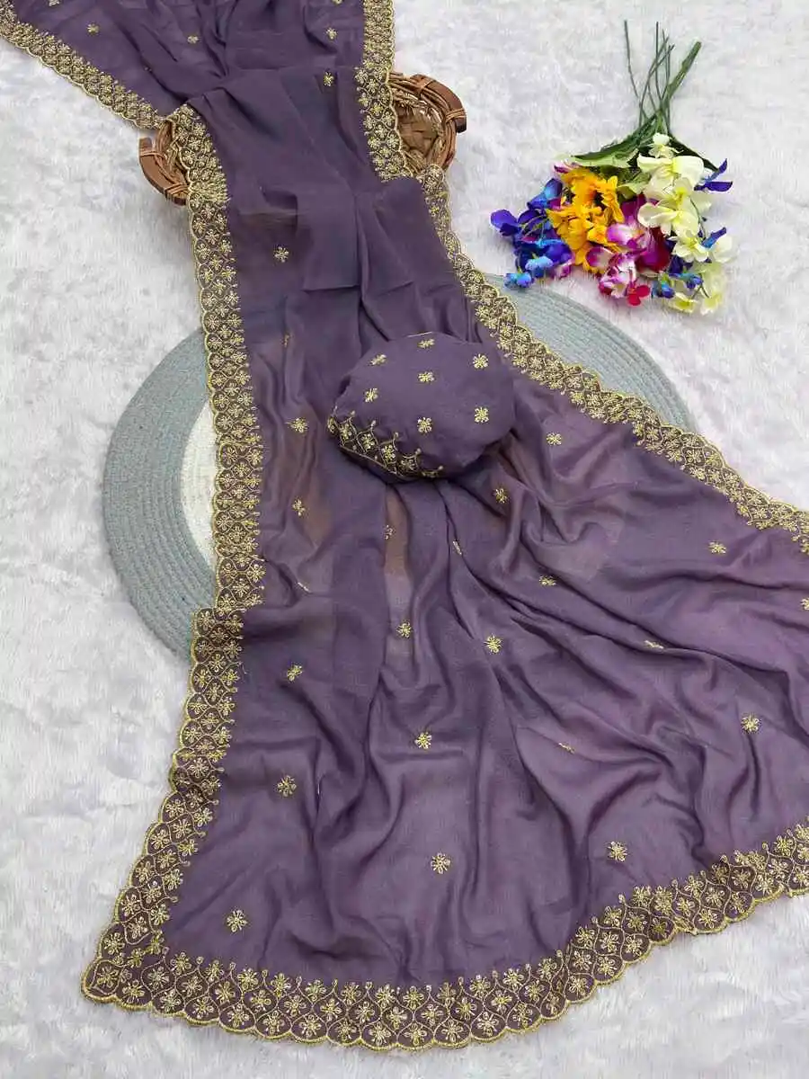 DESIGNER GEORGETTE VAL SEQUENCE EMBROIDERY CONTRAST PALLU WORK SAREE WITH UNSTITCHED BLOUSE PURPLE