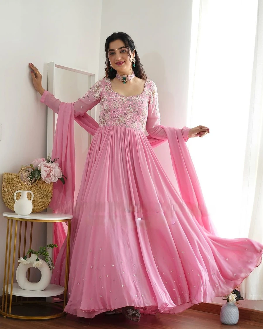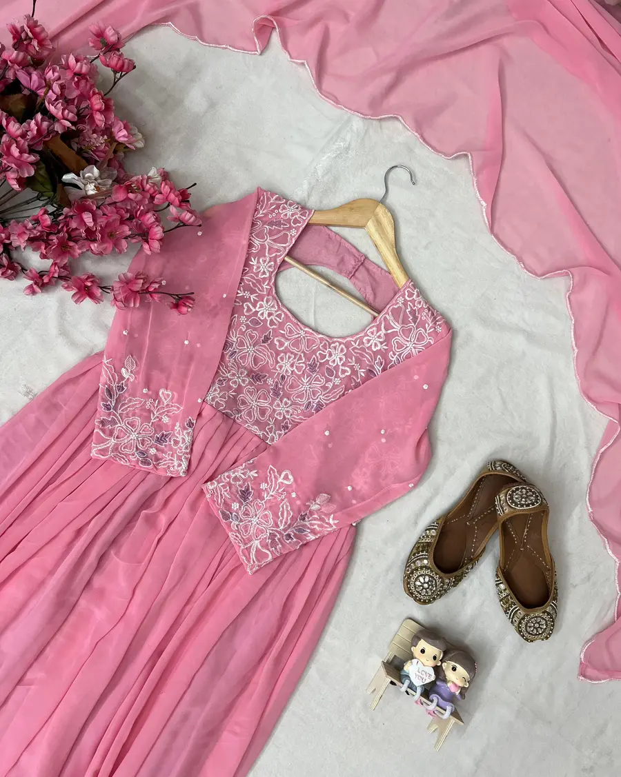 DESIGNER GEORGETTE ZARI & SEQUENCE EMBROIDERY WORK GOWN WITH DUPATTA BABY PINK