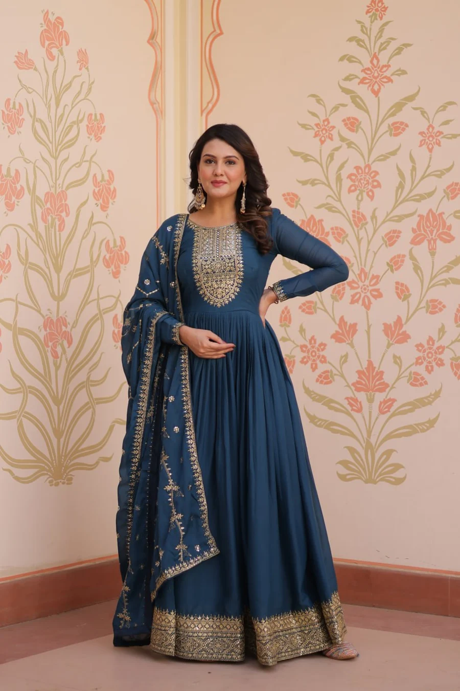 DESIGNER GEORGETTE ZARI & SEQUENCE EMBROIDERY WORK GOWN WOTH DUPATTA TEAL