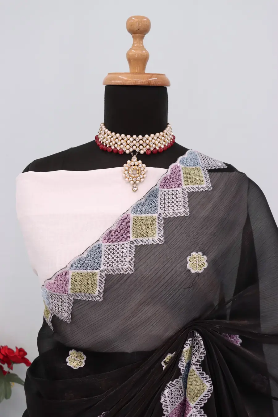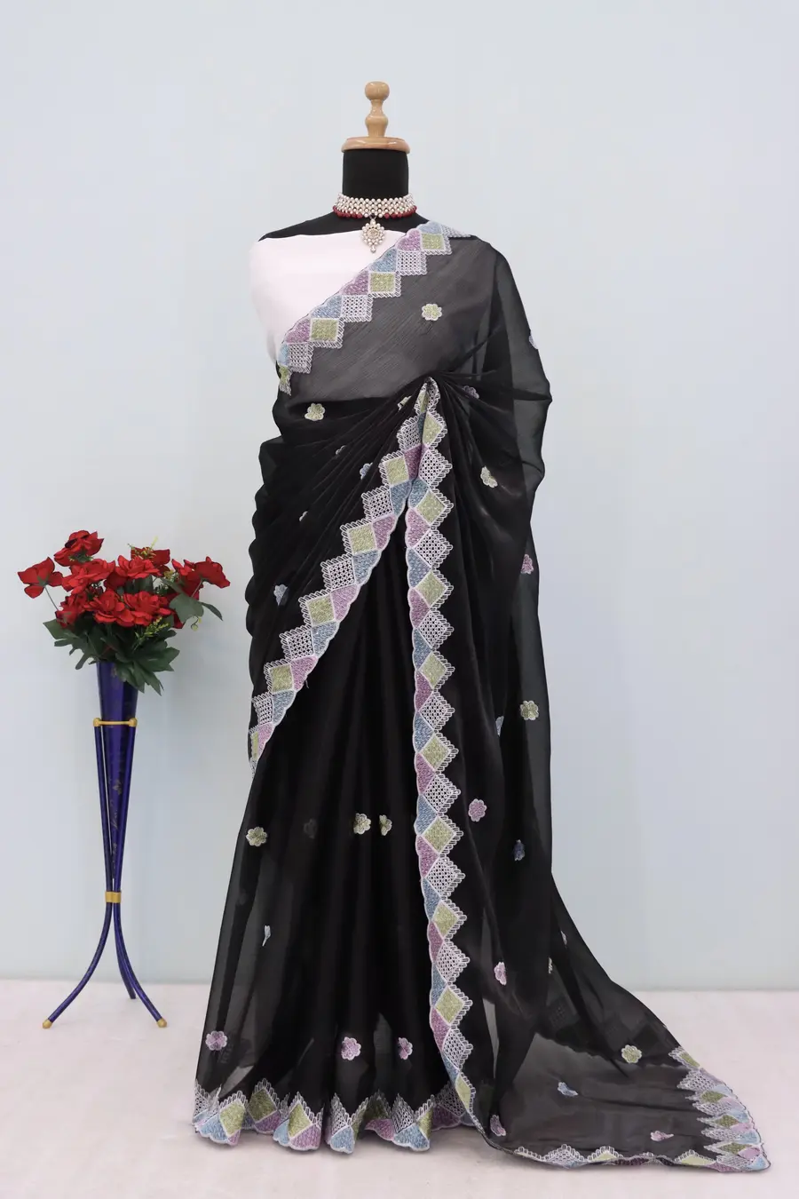 SAREE FABRIC : PREMIUM DIAMOND CHINON SILK WITH HEAVY EMBROIDERY CODING MULTI TREAD & SEQUENCE WORK WITH PIPING BORDER