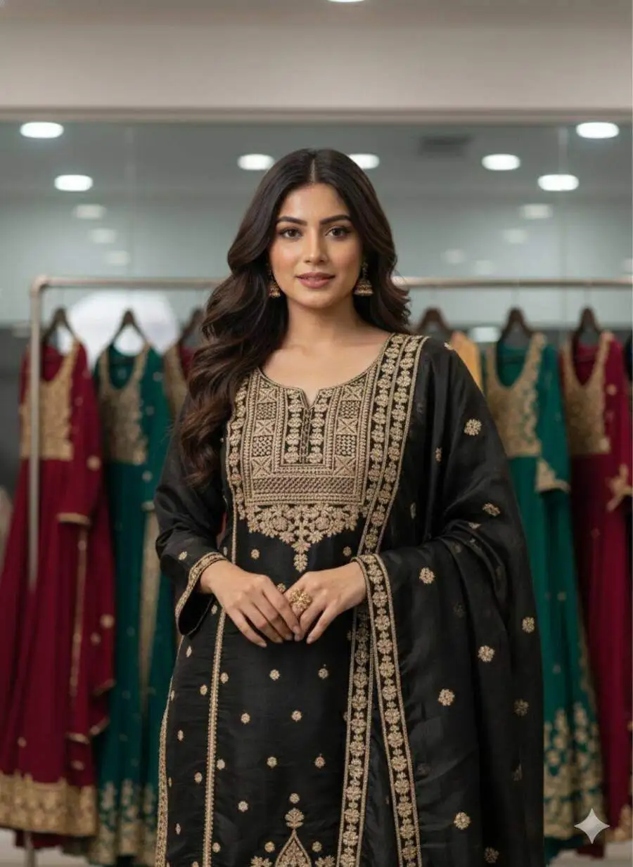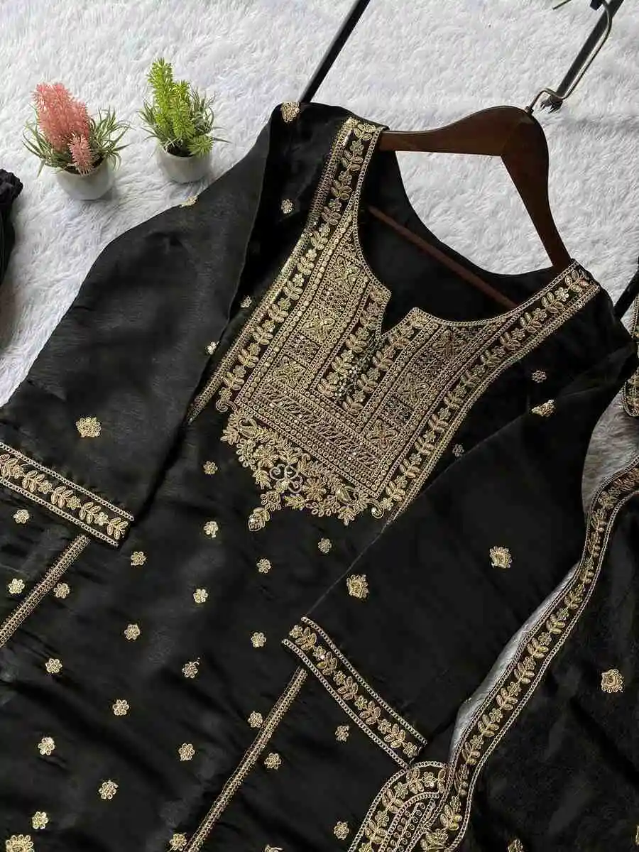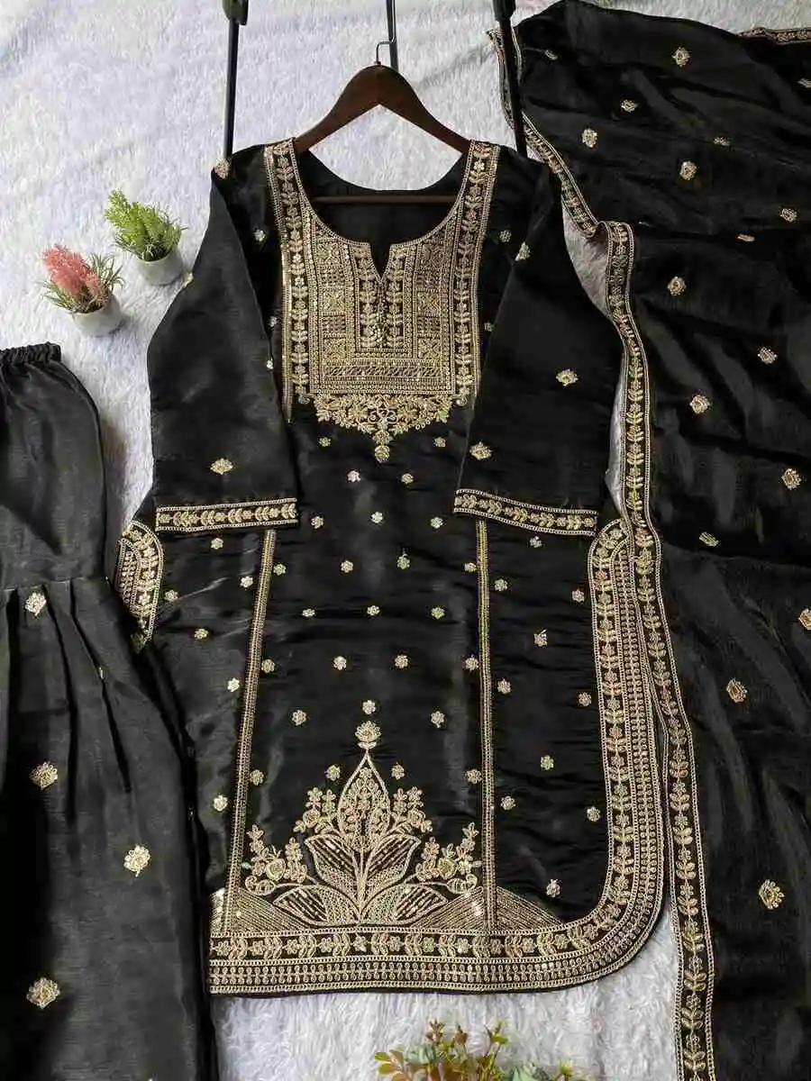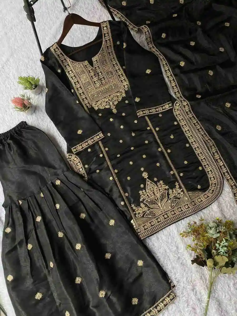 DESIGNER GMY SILK CODING SEQUENCE EMBROIDERY WORK TOP SHARARA WITH DUPATTA BLACK