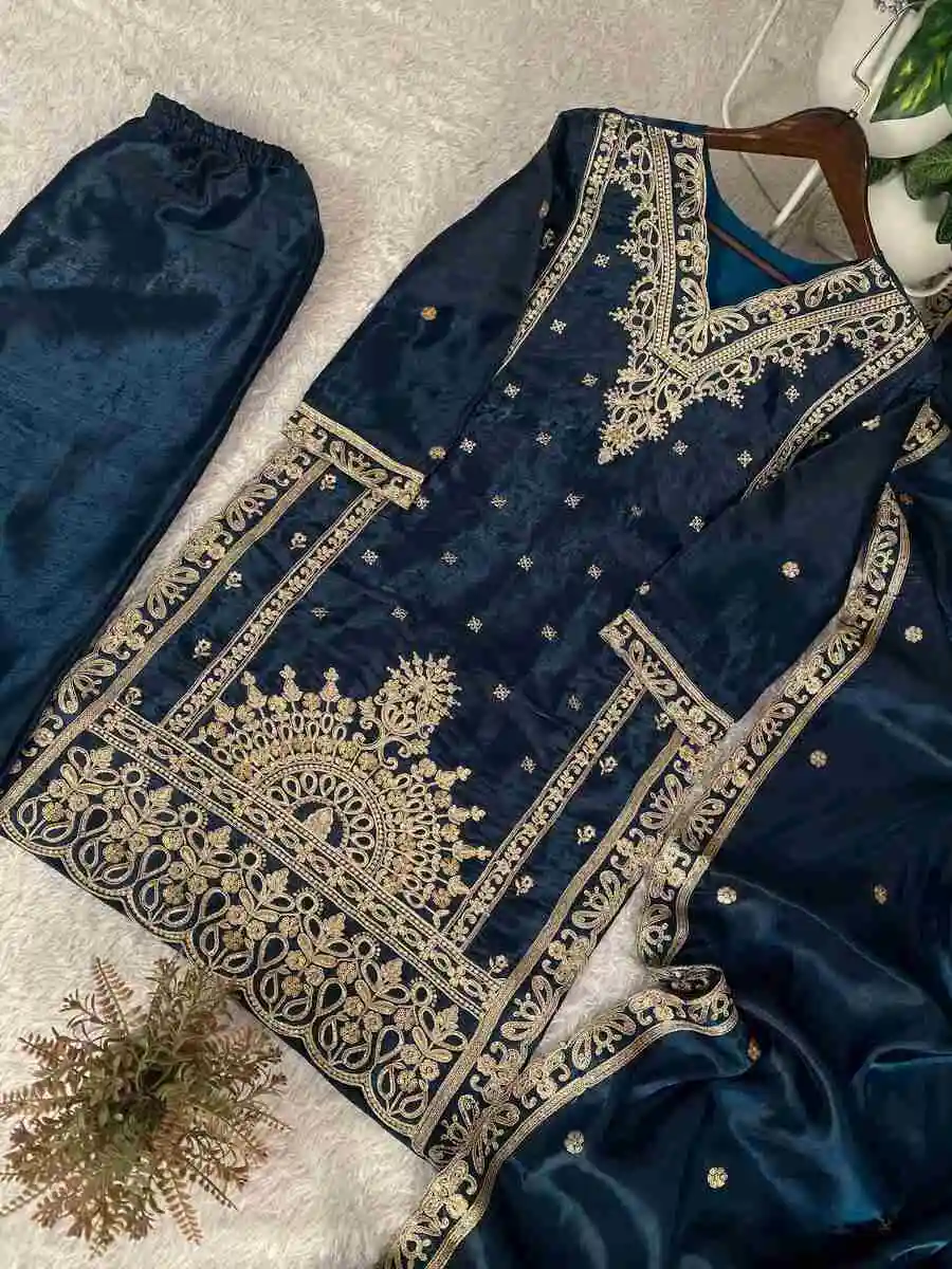 DESIGNER GMY SILK CODING WITH SEQUENCE EMBROIDERY WORK TOP PALAZZO WITH DUPATTA NAVY BLUE