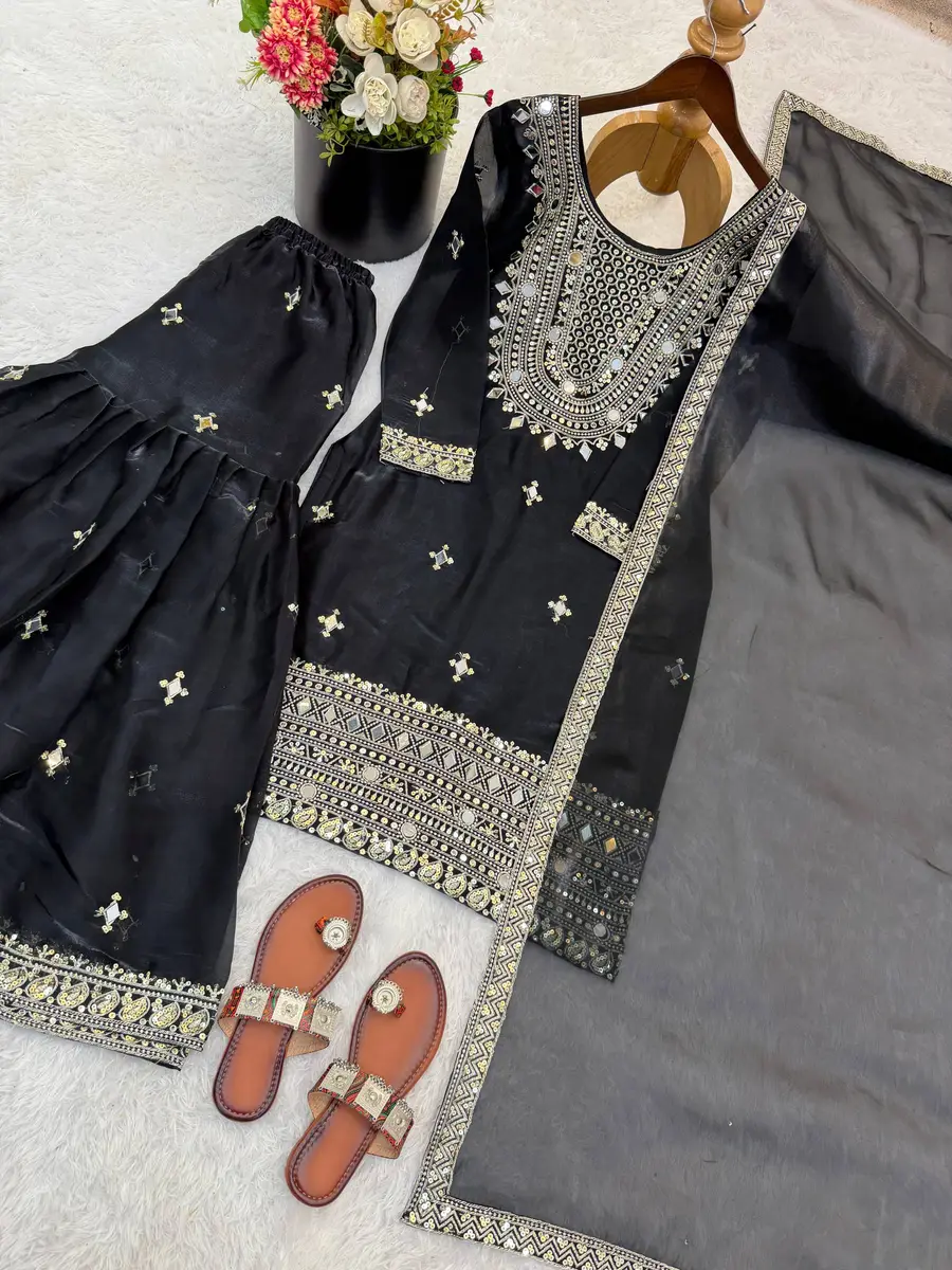 DESIGNER GMY SILK EMBROIDERY SEQUENCE AND REAL MIRROR WORK TOP SHARARA WITH DUPATTA BLACK