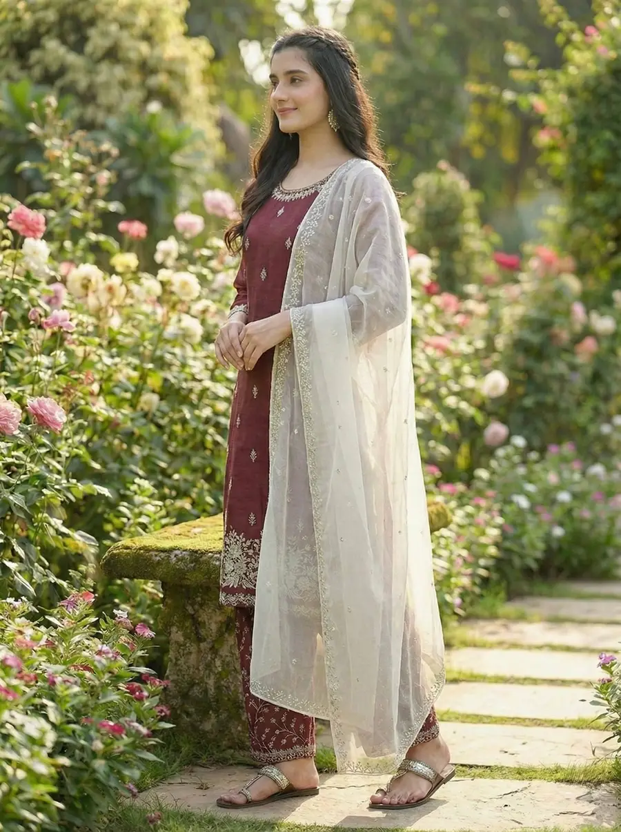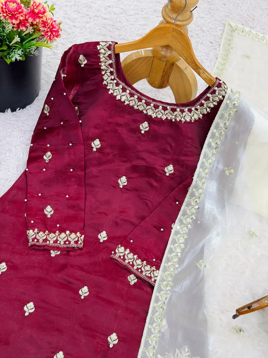 DESIGNER GMY SILK EMBROIDERY SEQUENCE WORK TOP PALAZZO WITH DUPATTA MAROON