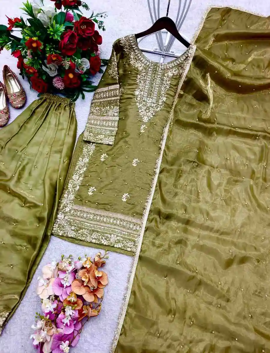 DESIGNER GMY SILK EMBROIDERY SEQUENCE WORK WITH RIVET MOTI WORK TOP PALAZZO WITH DUPATTA PISTA