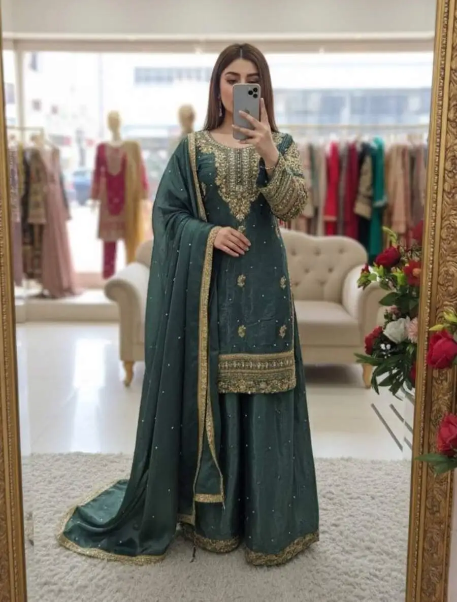 DESIGNER GMY SILK EMBROIDERY SEQUENCE WORK WITH RIVET MOTI WORK TOP PALAZZO WITH DUPATTA TEAL