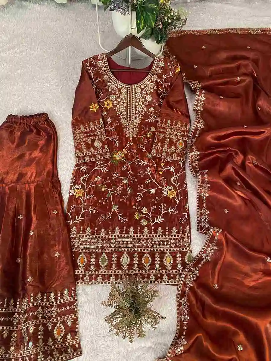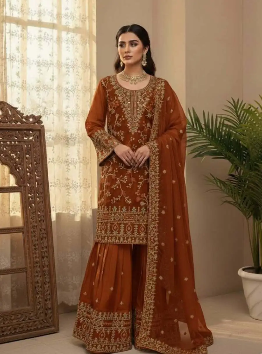 DESIGNER GMY SILK SEQUENCE EMBROIDERY WORK TOP SHARARA WITH DUPATTA FESTIVE WEAR WHOLESALE PRICE ETHNIC GARMENT ORANGE