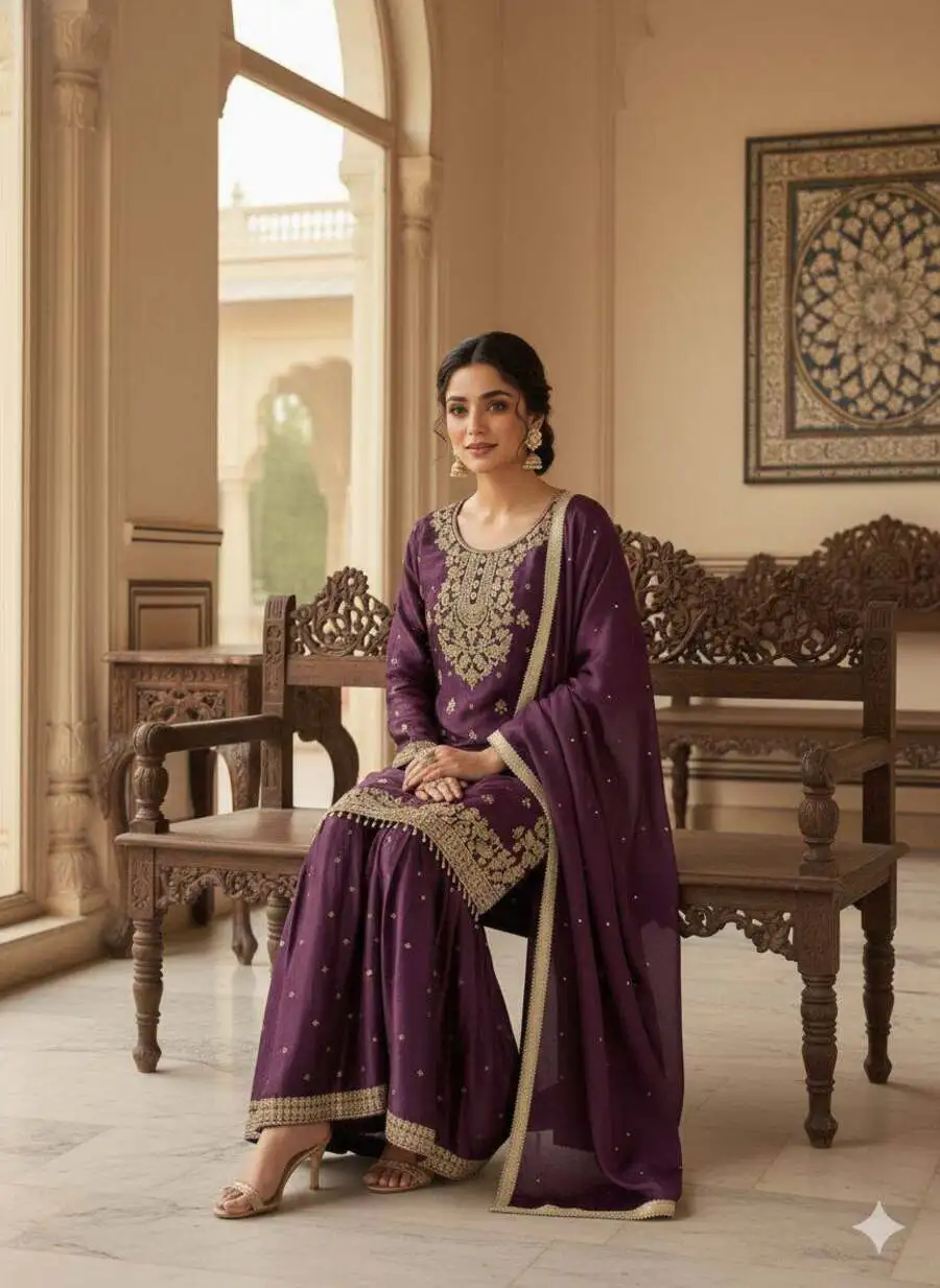 DESIGNER GMY SILK SEQUENCE EMBROIDERY WORK TOP SHARARA WITH DUPATTA WINE