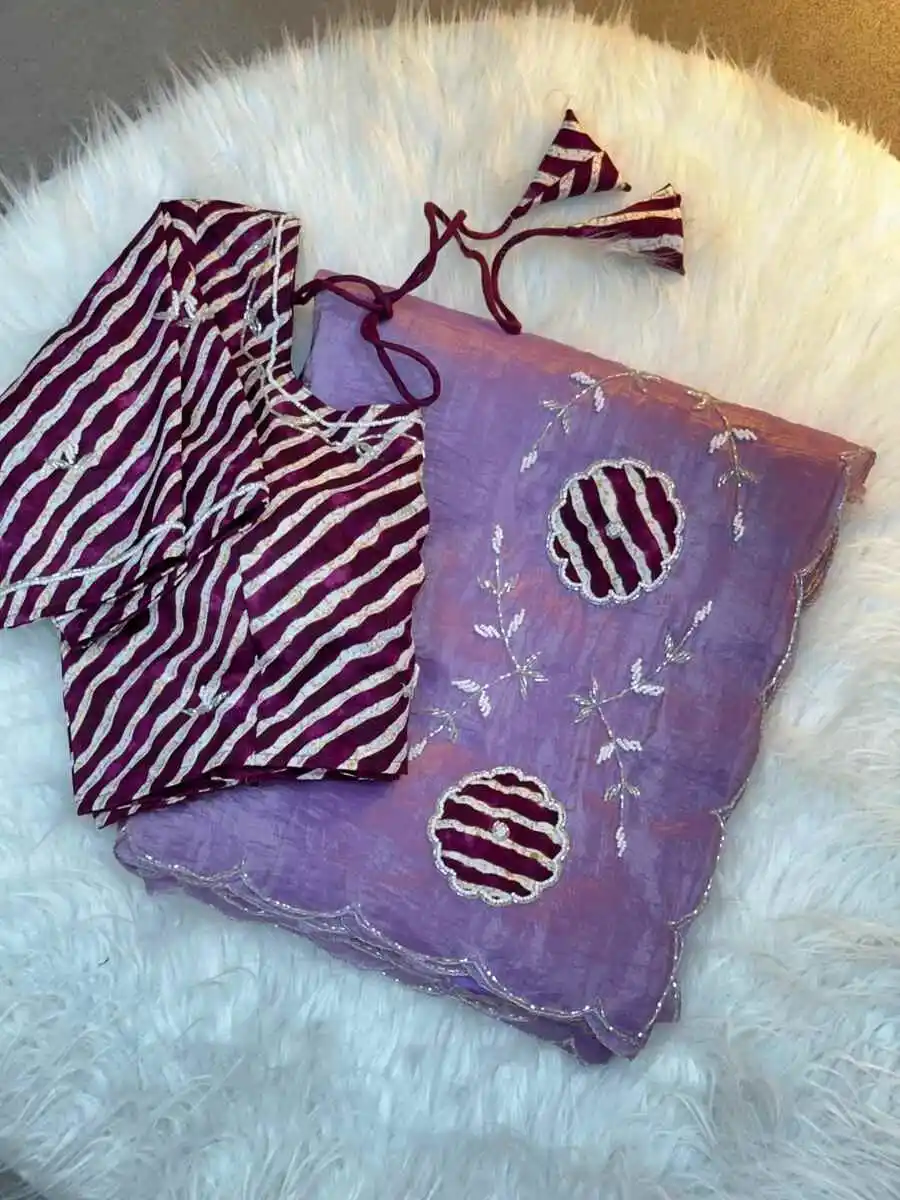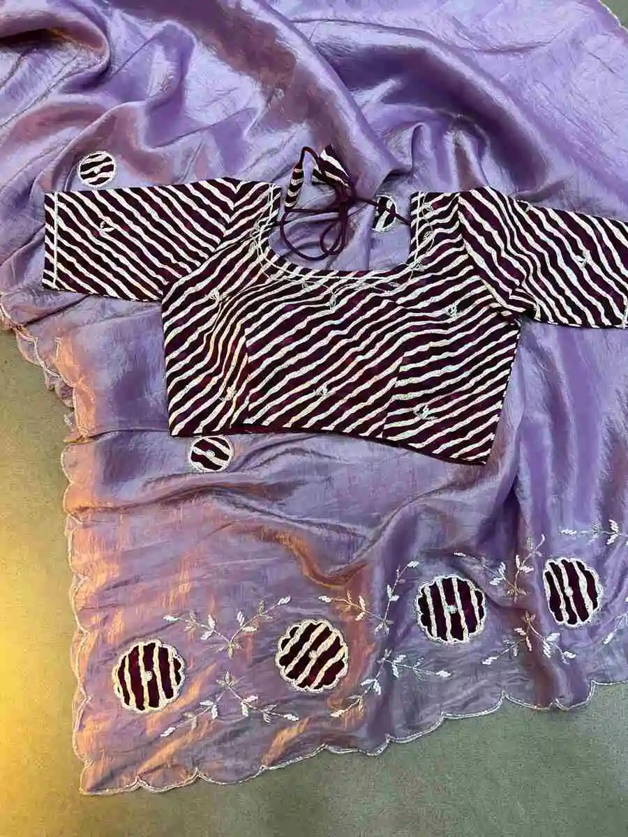 DESIGNER GOLD CRUSH BANDHEJ HANDWORK CUTDANA BUTTA AND RICH PALLU AND FOIL PRINT WORK SAREE WITH UNSTITCHED BLOUSE LAVENDER