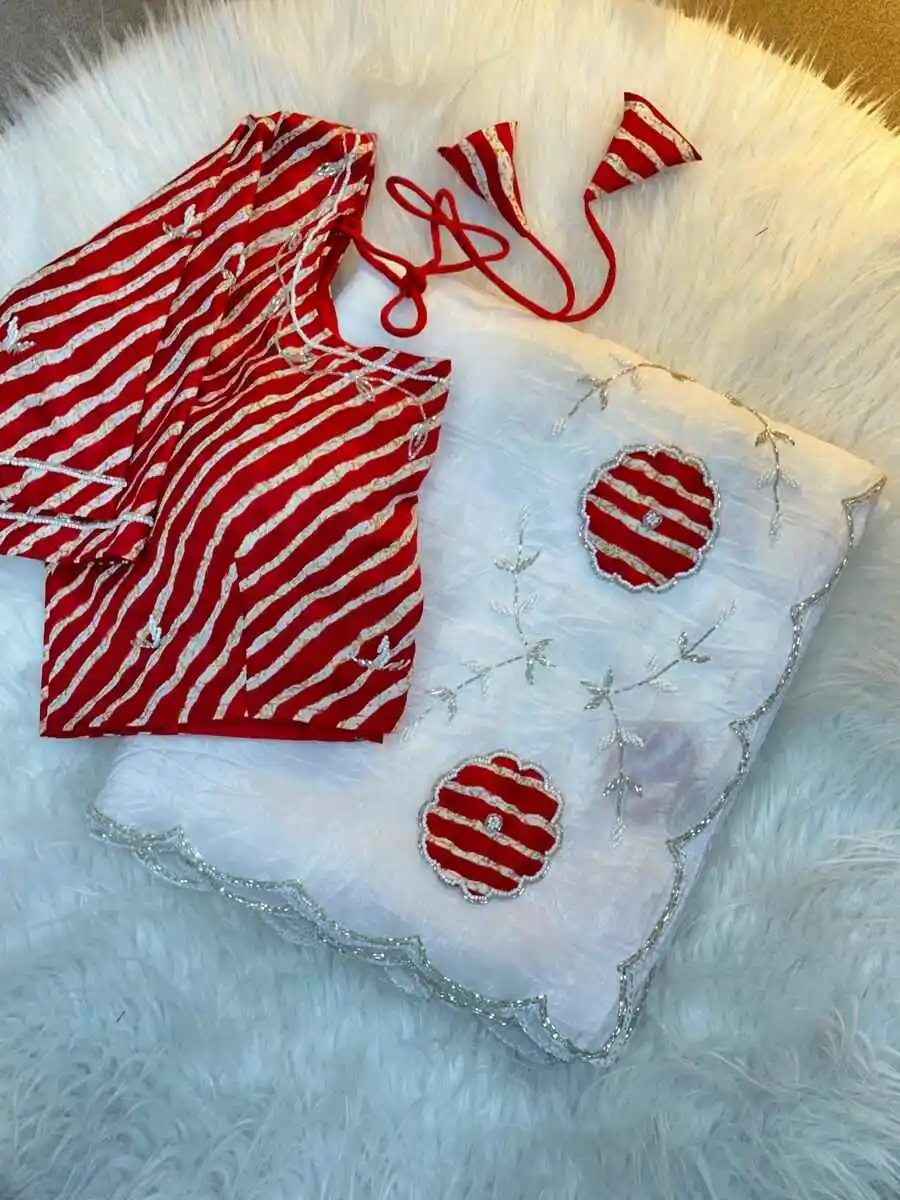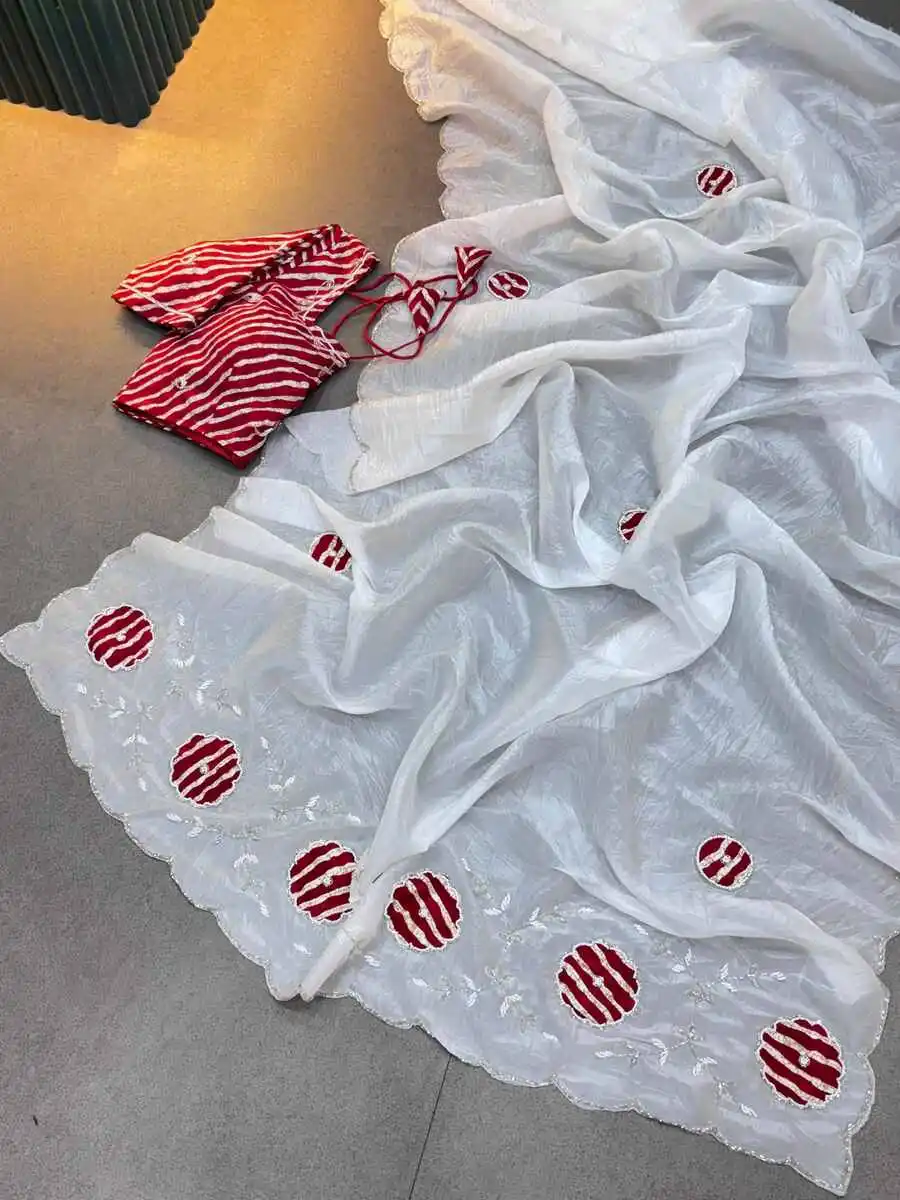 DESIGNER GOLD CRUSH BANDHEJ HANDWORK CUTDANA BUTTA AND RICH PALLU AND FOIL PRINT WORK SAREE WITH UNSTITCHED BLOUSE WHITE