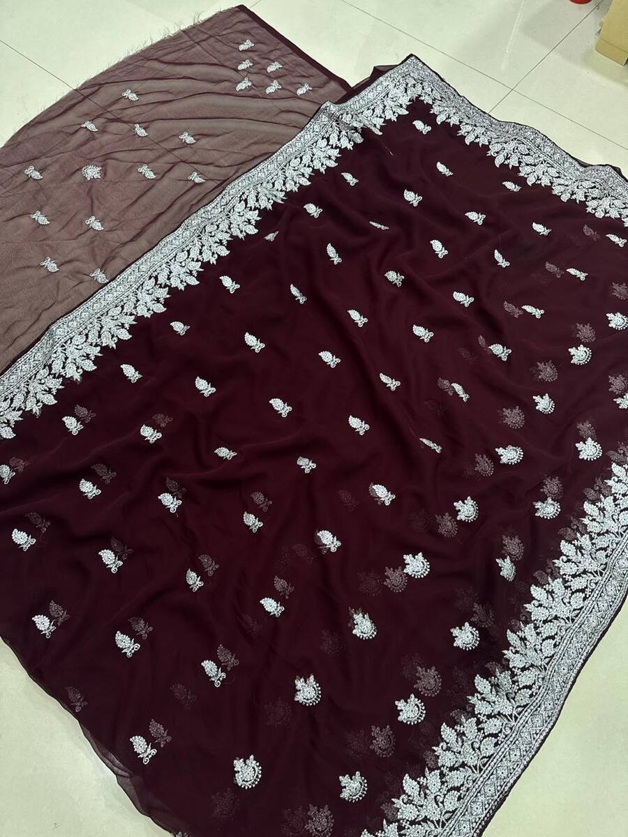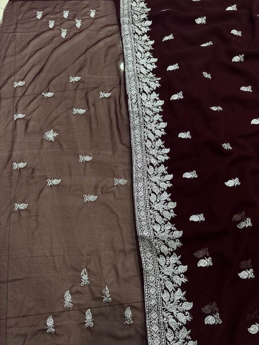 DESIGNER HEAVY FAUX GEORGETTE EMBRIDORRY WORK SAREE WITH UNSTITCHED BLOUSE BROWN