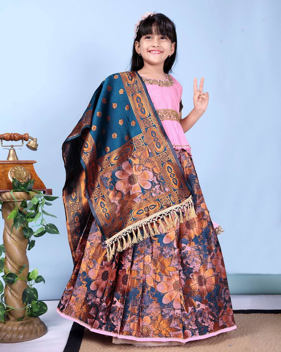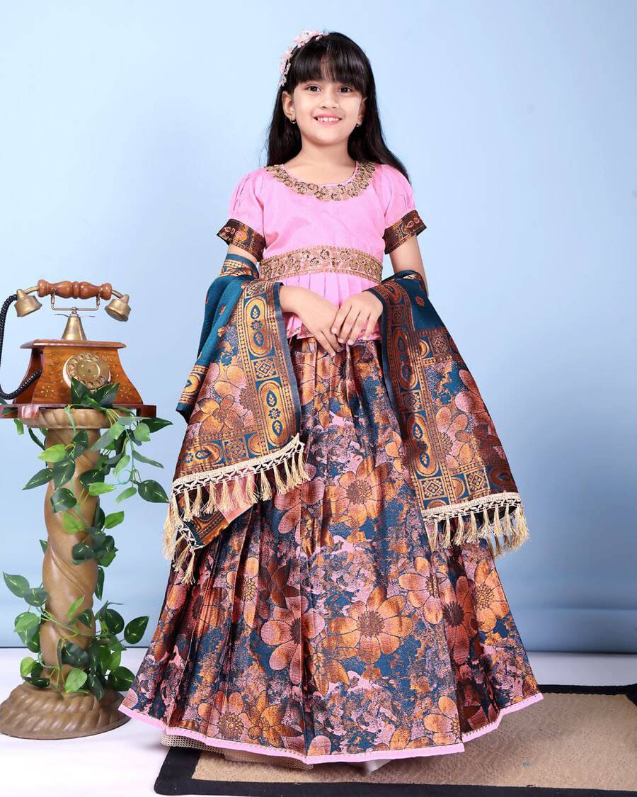 DESIGNER JACQUARD WEAVING WORK KID’S LEHENGA CHOLI WITH DUPATTA PINK