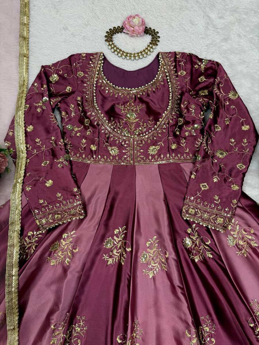 DESIGNER JAPAN SATIN THREAD WITH SEQUENCE WORK GOWN WITH DUPATTA WINE PINK