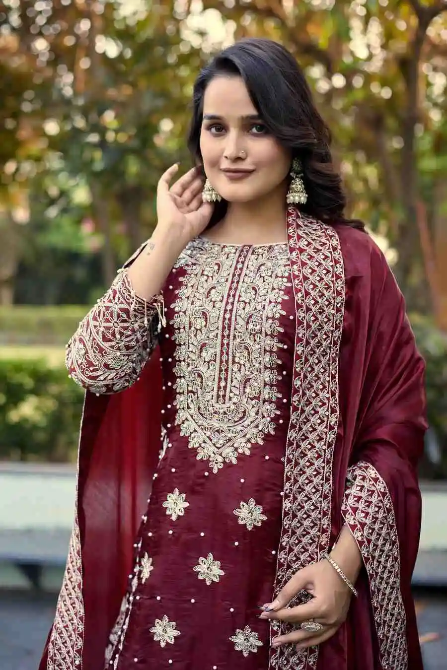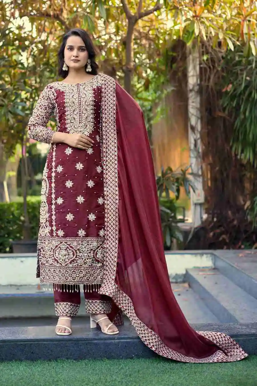 DESIGNER JC SILK EMBROIDERY CODING-3MM SEQUENCE WORK TOP BOTTOM WITH DUPATTA MAROON