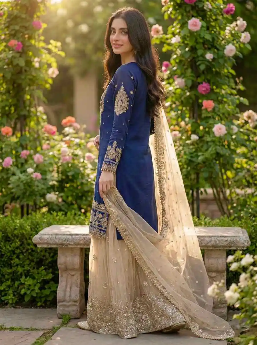 DESIGNER JC SILK EMBROIDERY CODING DORI-SEQUENCE WORK WITH RIVET MOTI WORK TOP SHARARA WITH DUPATTA BLUE