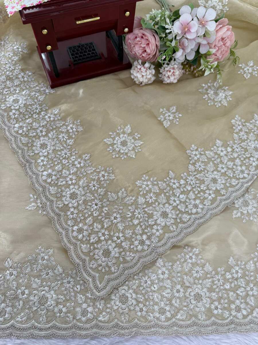 SAREE FABRIC : PURE SOFT TABBY ORGANZA WITH HEAVY EMBROIDERY MULTI TREADS , CODING & SEQUENCE WORK & FANCY CUT WORK BORDER